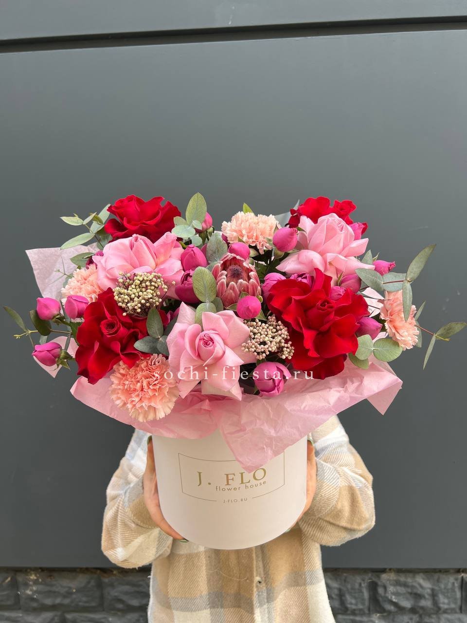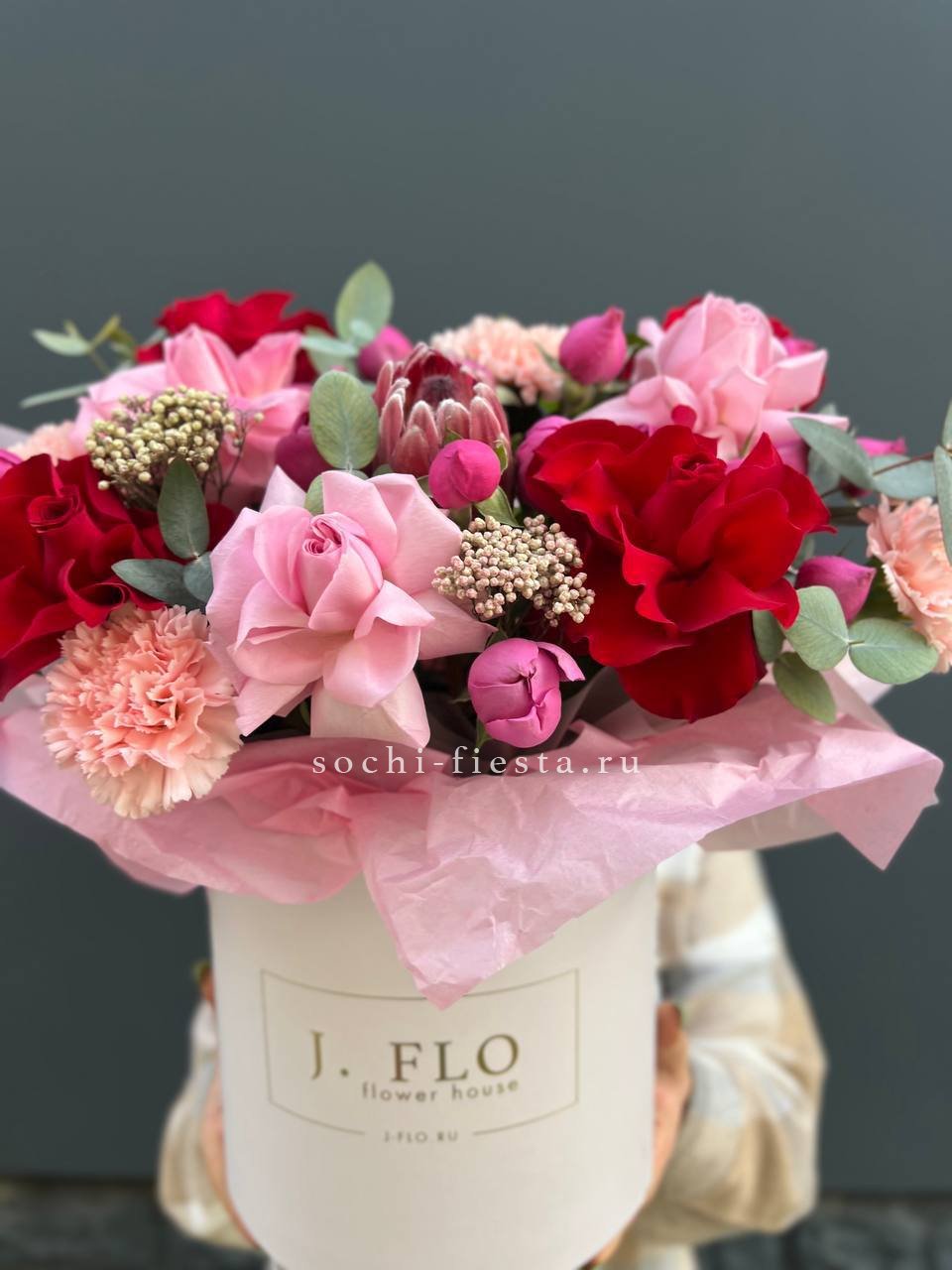 Состав: розы, диантусы, пионовидные кустовые розы, гортензия, эвкалипт, вспомогательная зелень, лента, дизайнерская упаковка