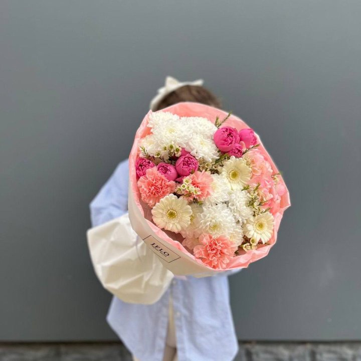 Букеты из эустом, альстромерий, диантусов, хризантем в Красной ПолянеСреднее время сборки: 35-45 минут