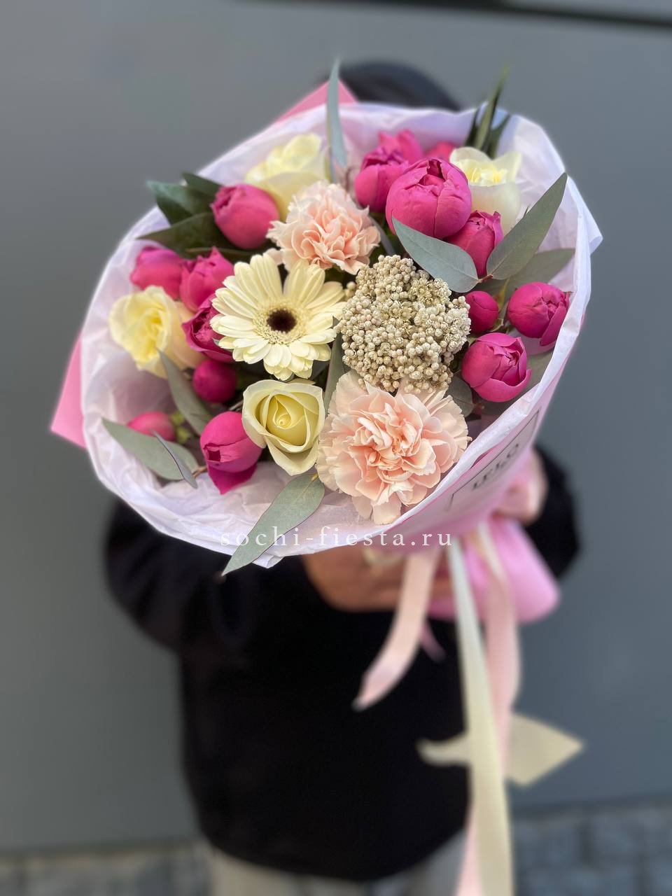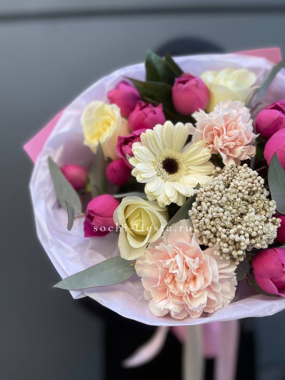 Состав: герберы, озатамус, эвкалипт, мисти баблс, белая роза, диантус в оформлении.