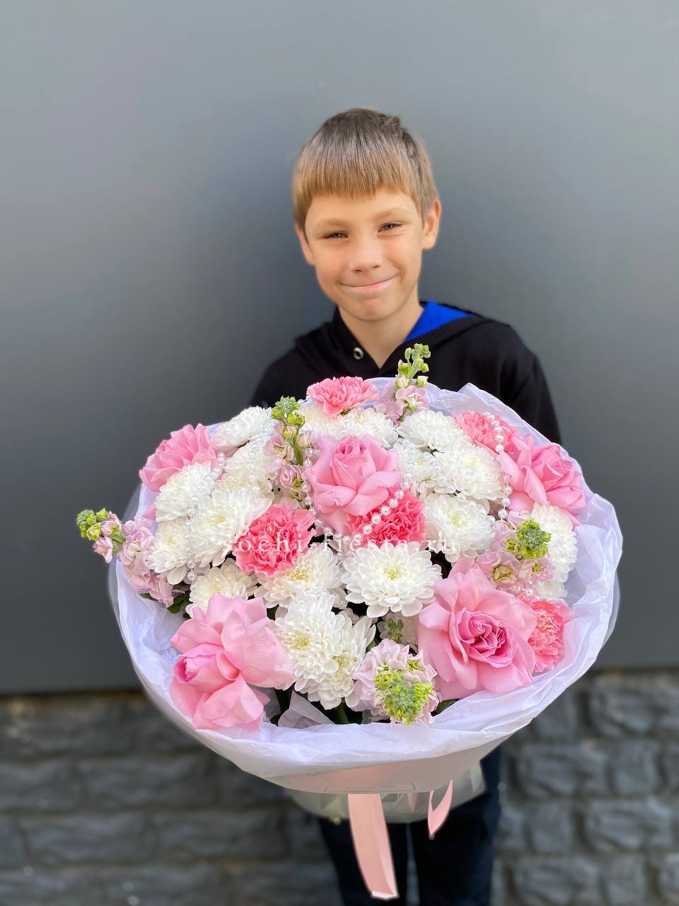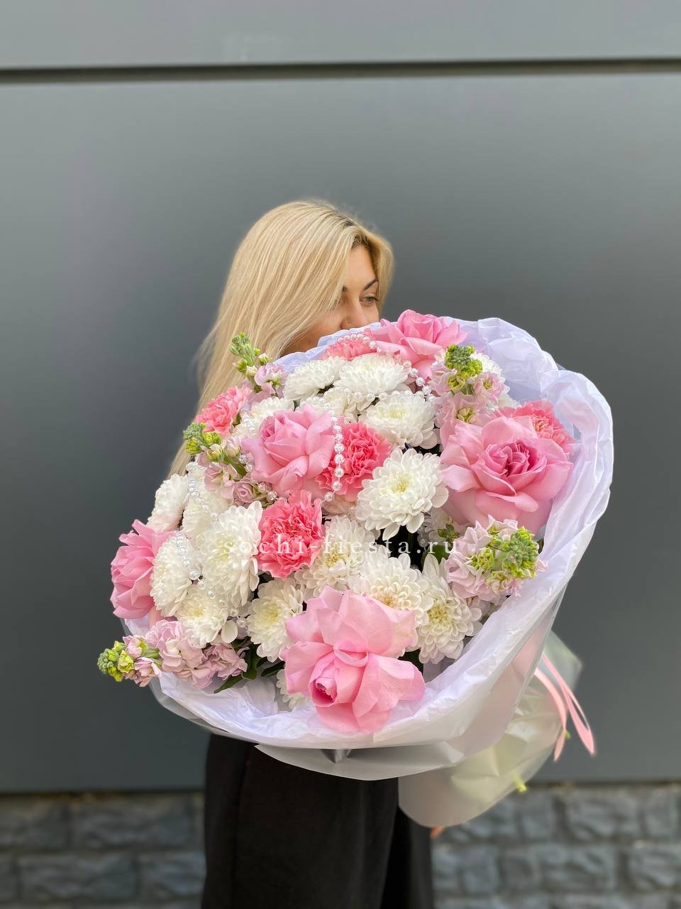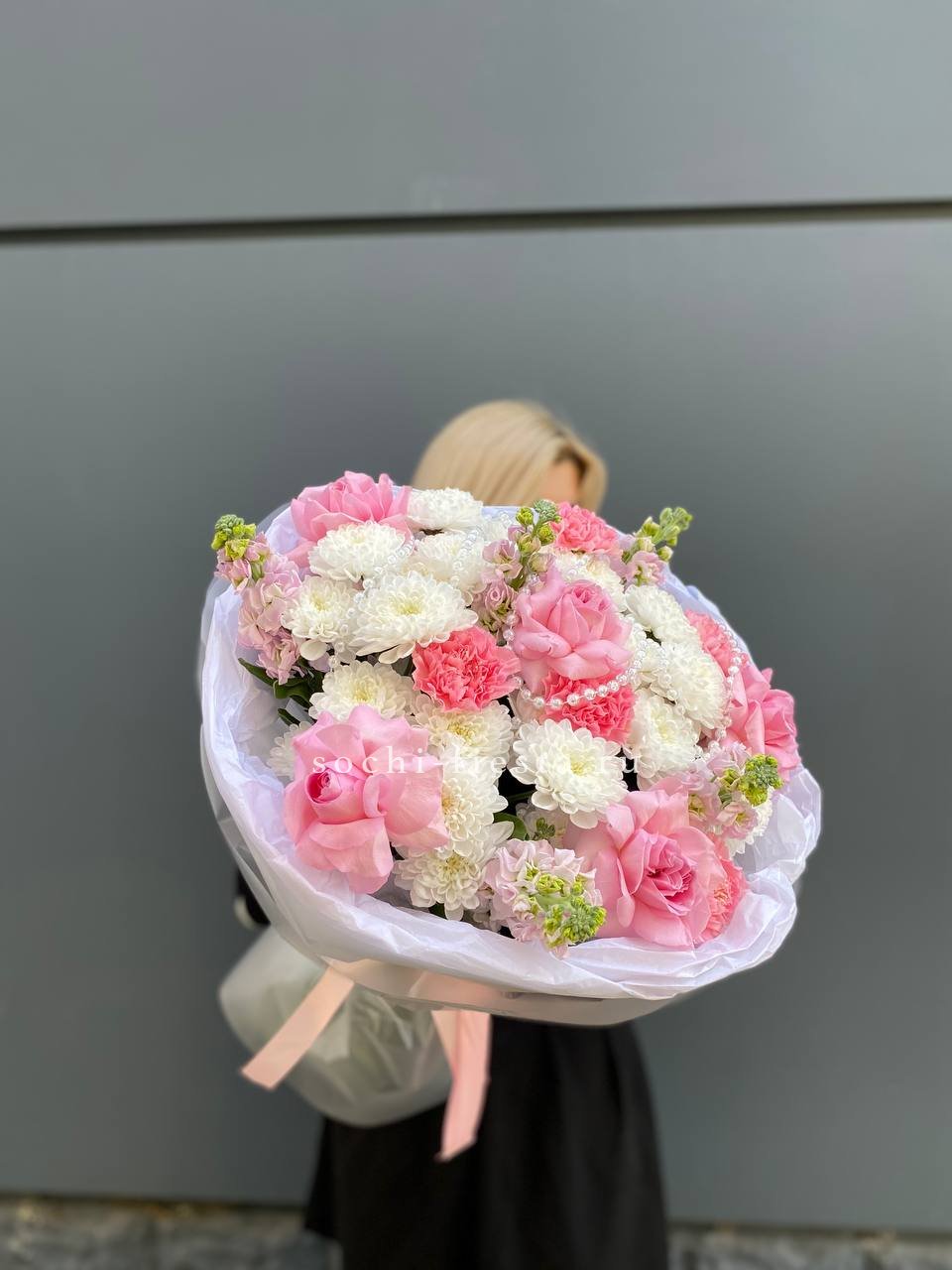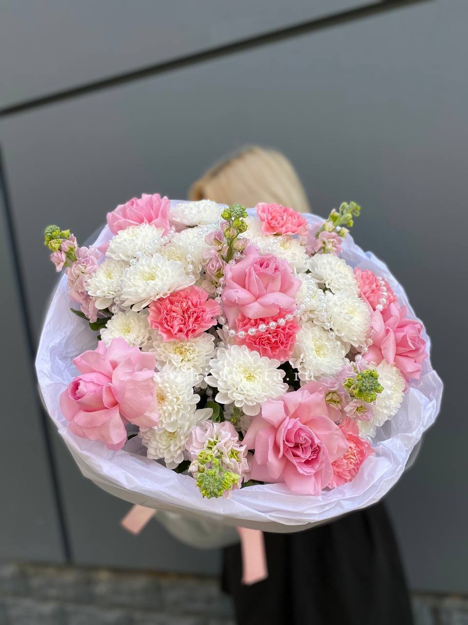 Состав : хризантемы, розы, диантусы, маттиола в оформлении с элементами бус (возможна замена)