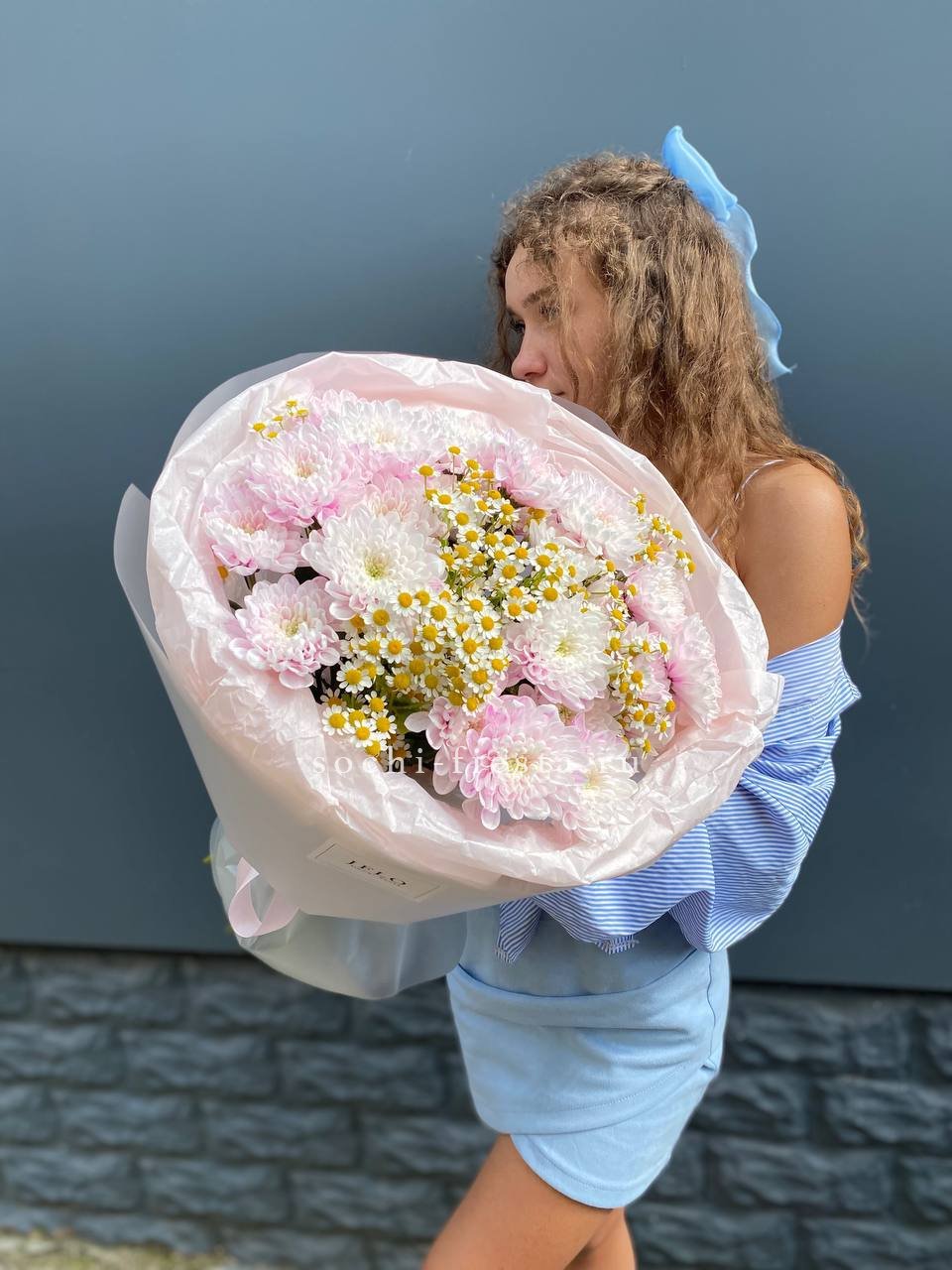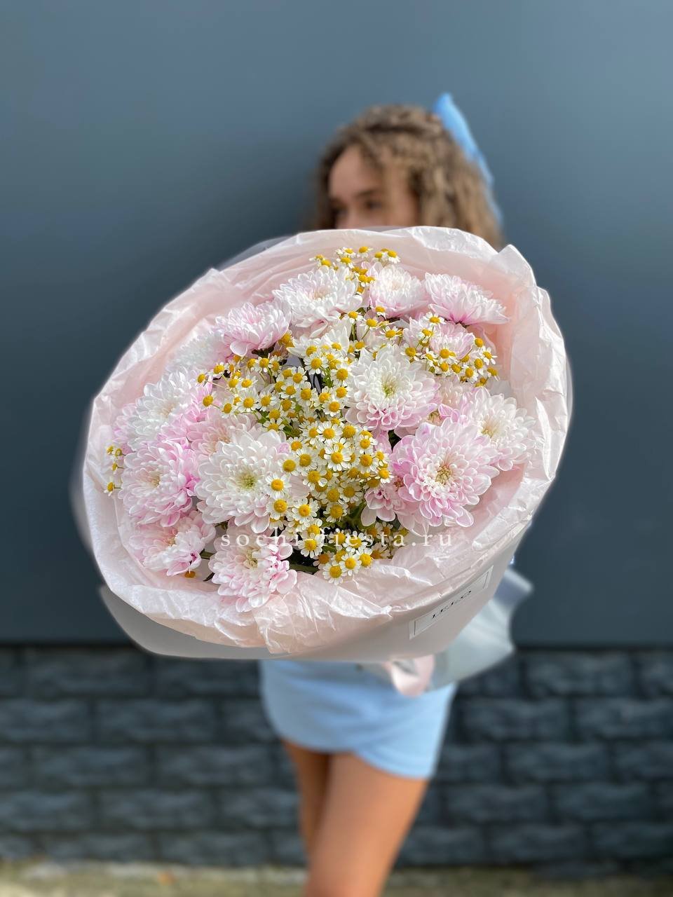 Сборный букет в составе которого ромашки, кустовые хризантемы, лента и дизайнерская пленка.