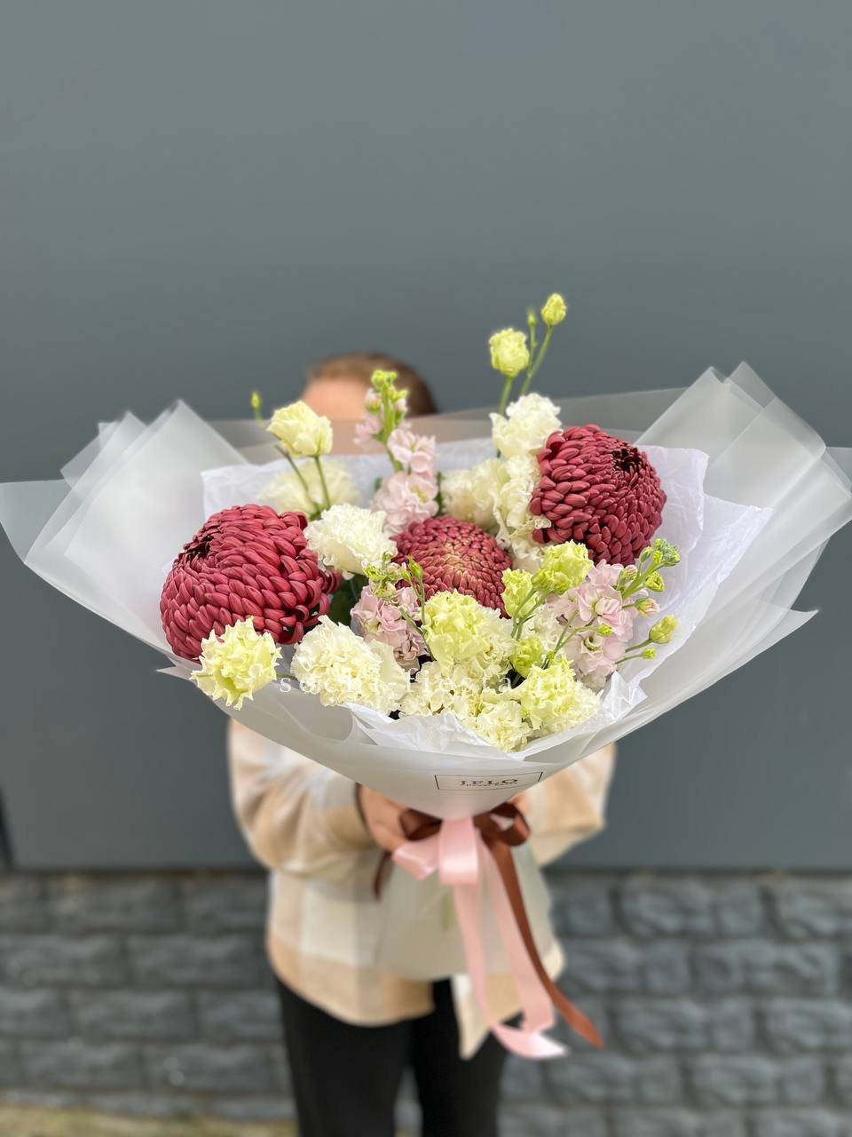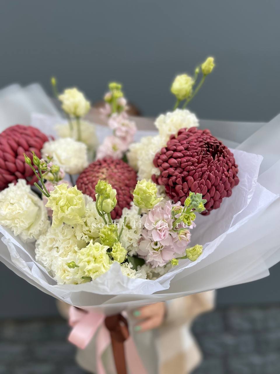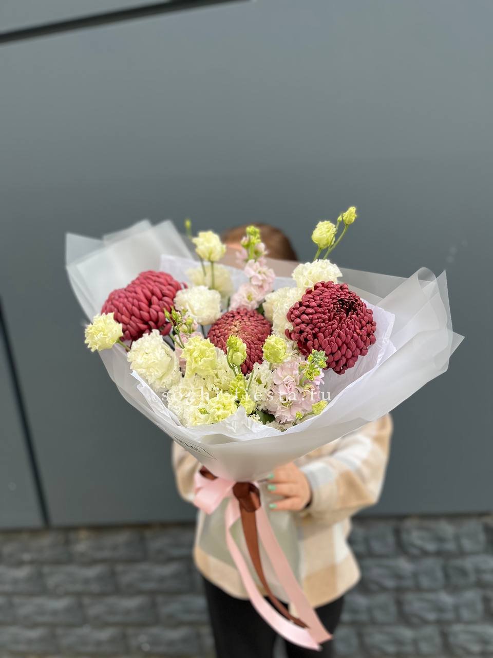 Состав: воздушный букет из стойкой маттиолы, эустомы и хризантемы Бигуди в оформлении