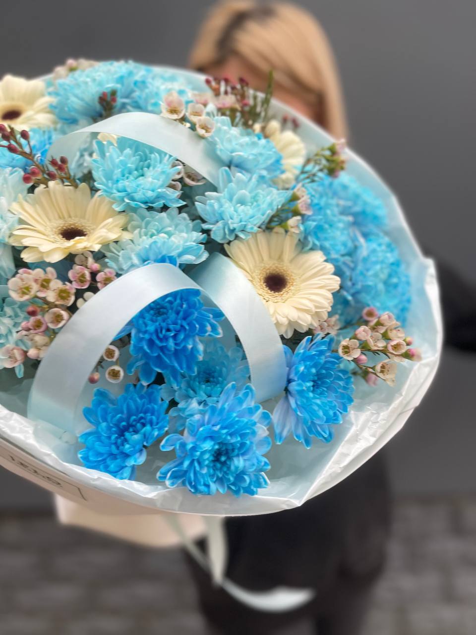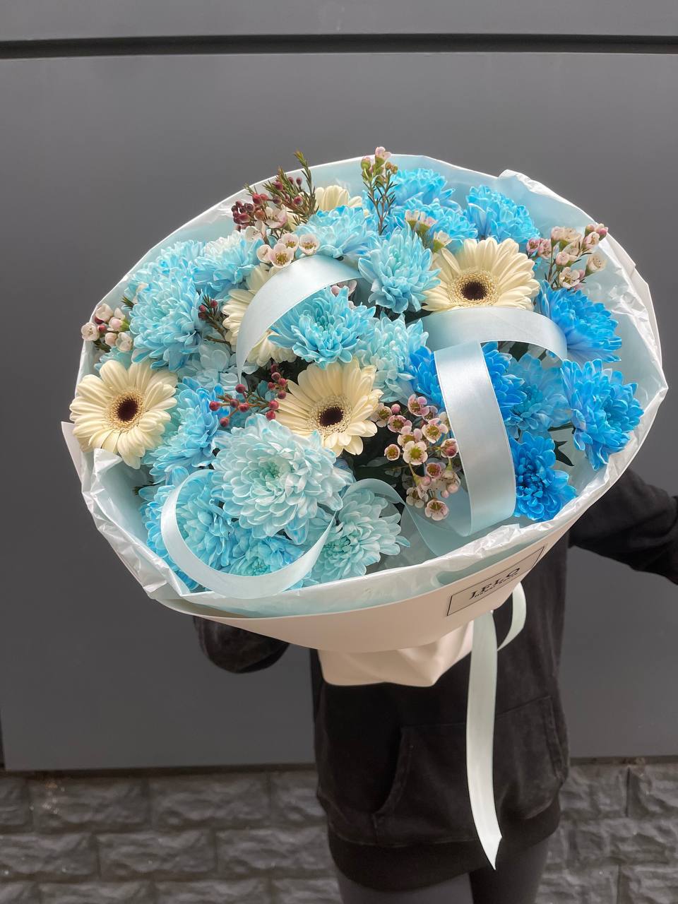 Этот невероятный букет — настоящее лазурное облако, которое переносит в атмосферу свежести и безмятежности. Композиция представляет собой стильный микс из голубых и нежно-бирюзовых кустовых хризантем, дополненных акцентными белыми герберами и мелкими соцветиями хамелациума.