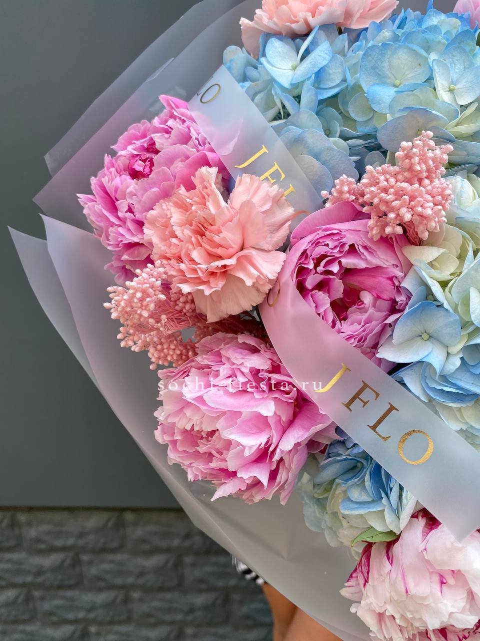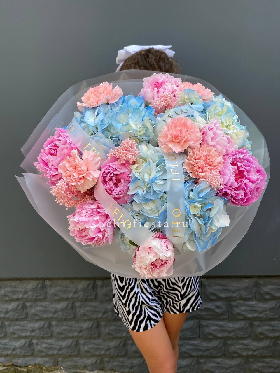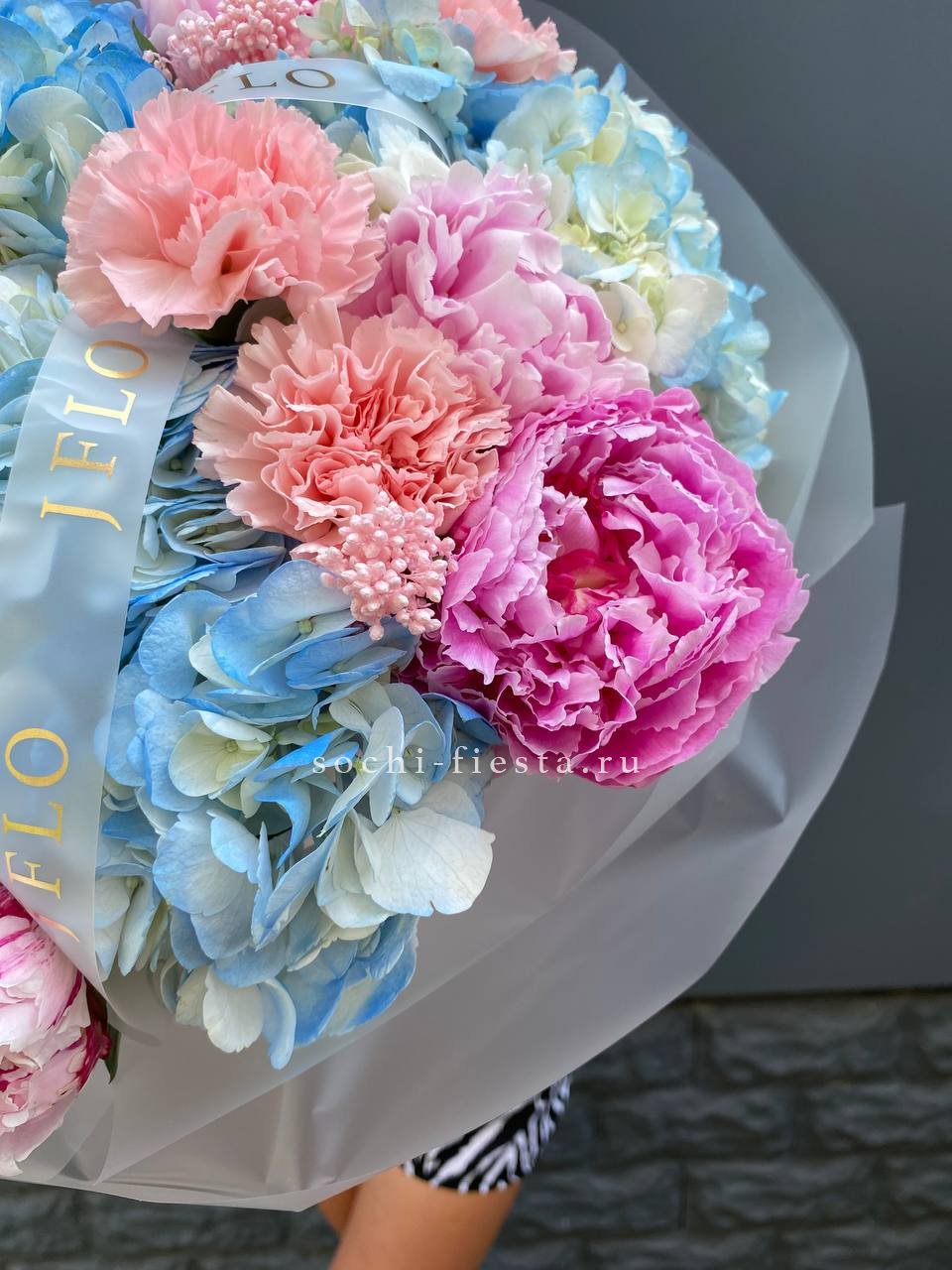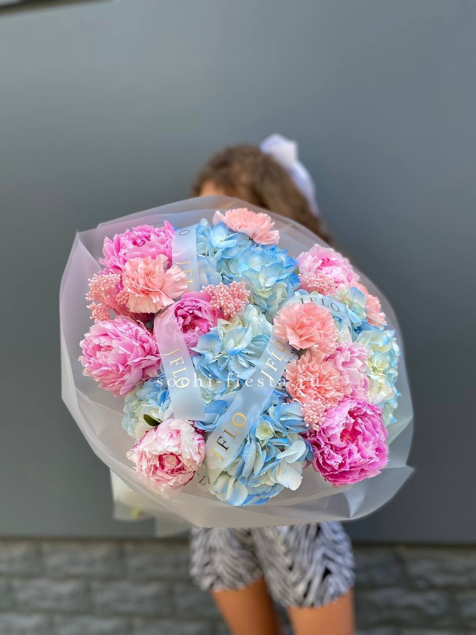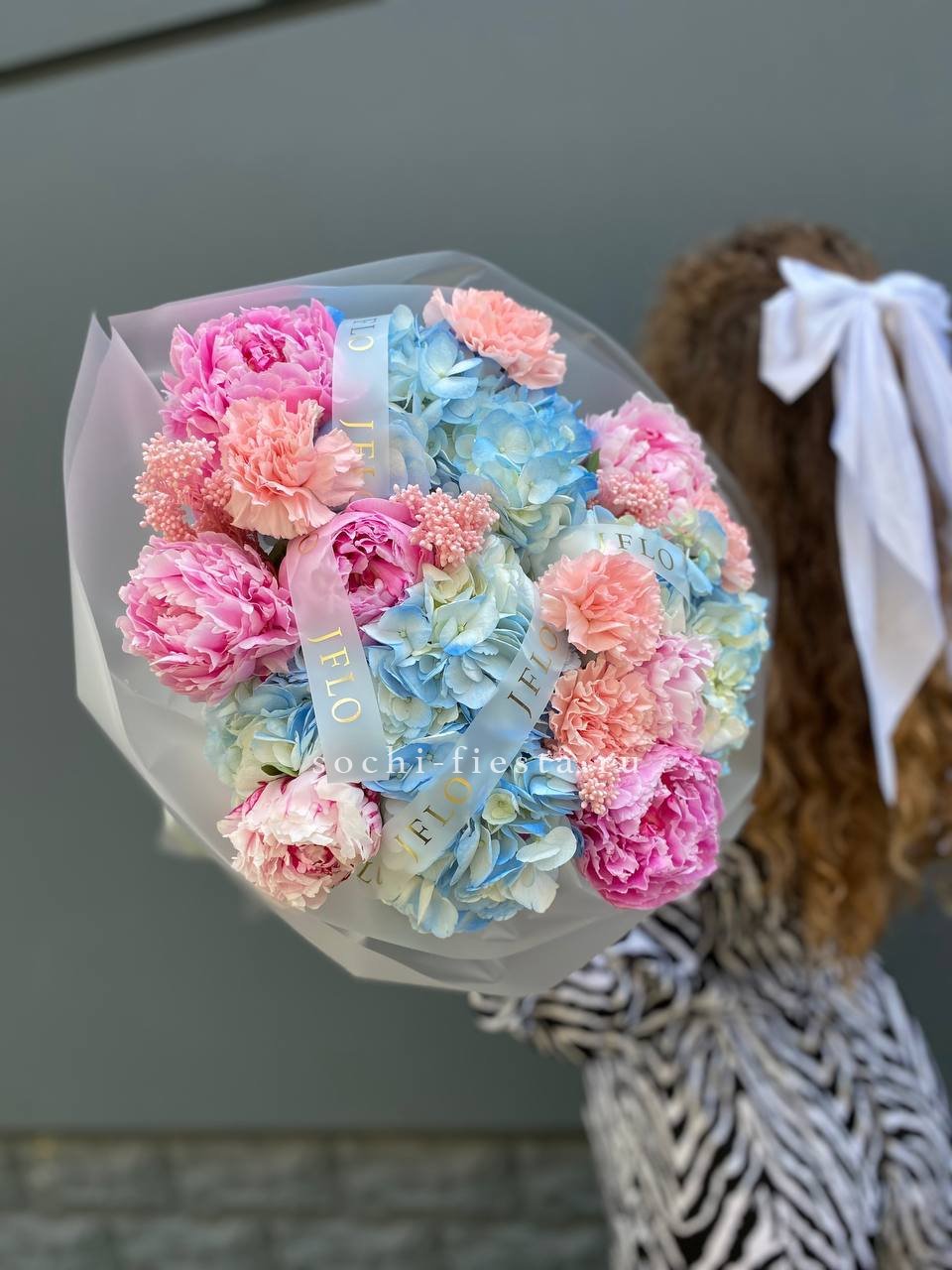 Авторский букет в составе которого: пионы, озатамус, гортензии, диантусы, лента и дизайнерская пленка.
