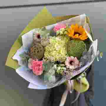 Состав: розы, кустовые розы Мисти Баблс, маттиола (или аналог вне сезона),  лента, дизайнерская пленка