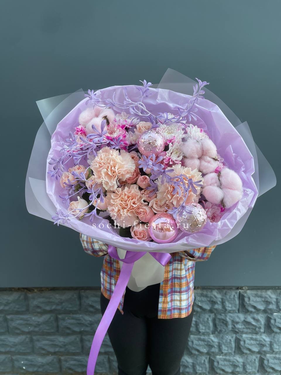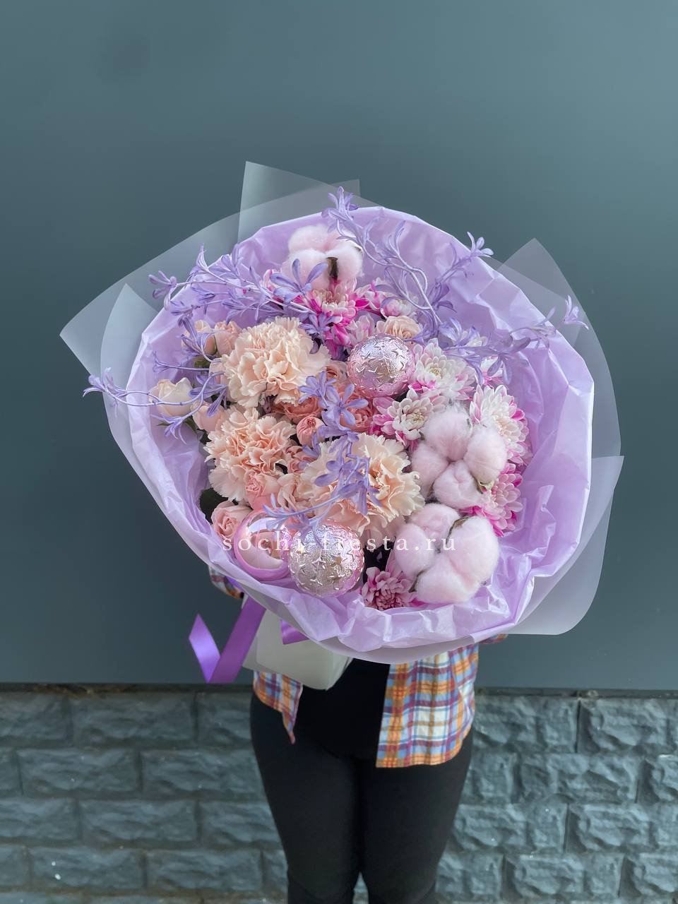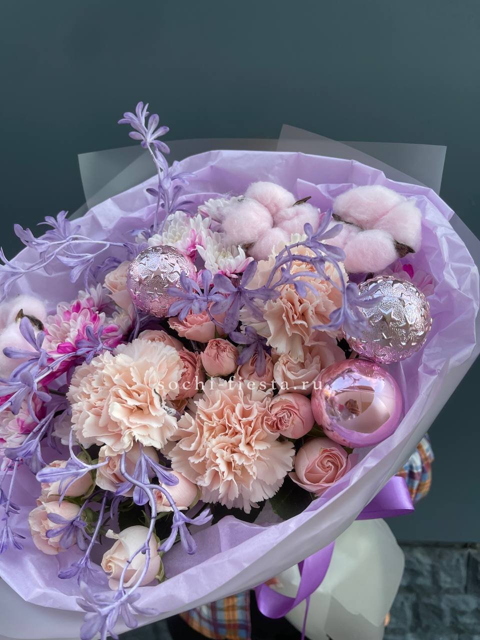 Букет выполнен в лавандовом цвете из стойких цветов с новогодней тематикой)