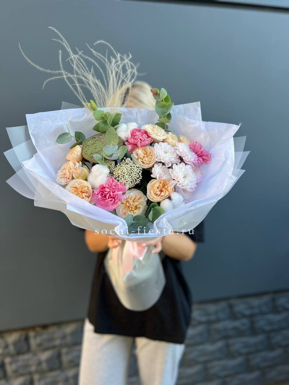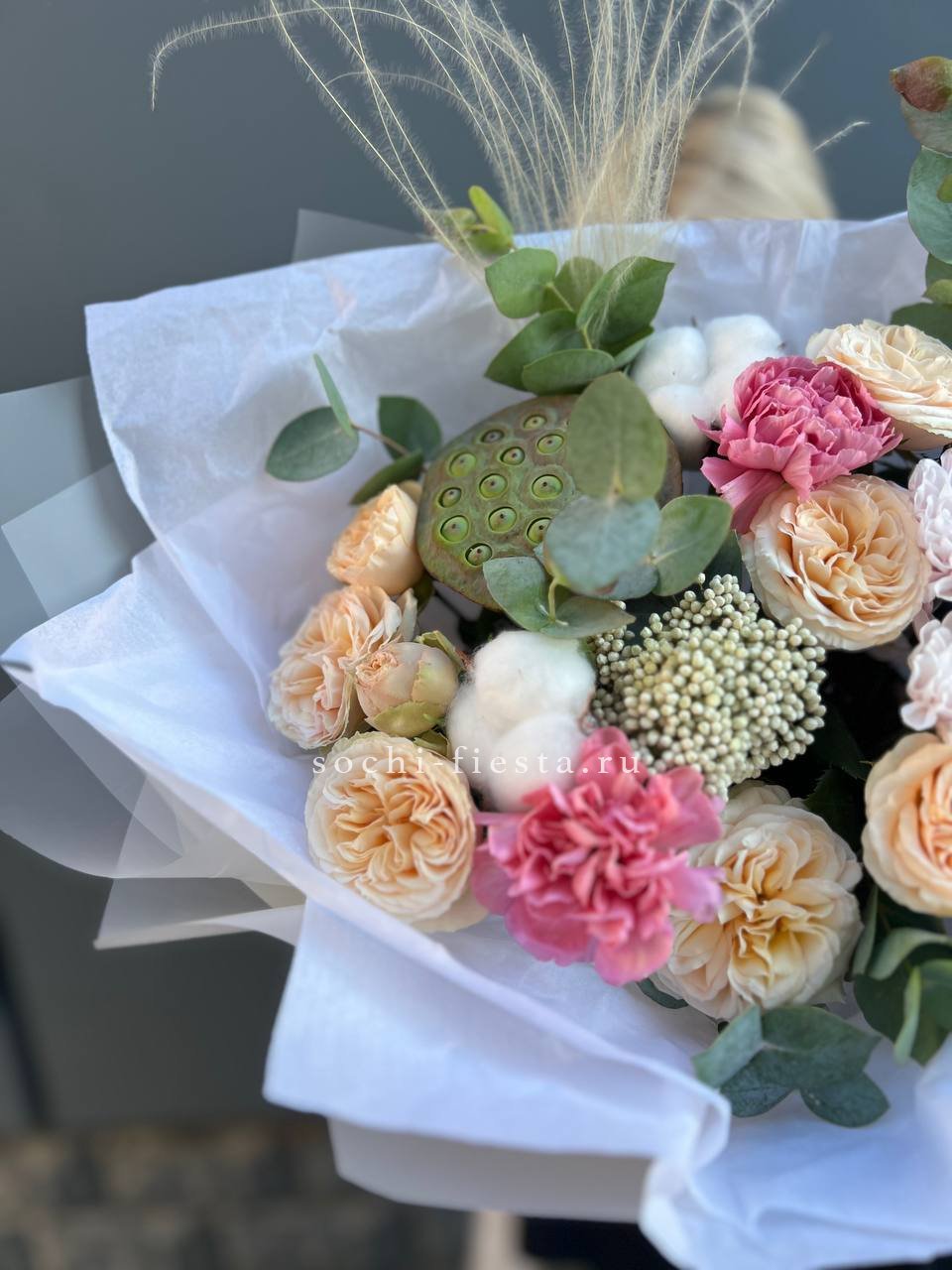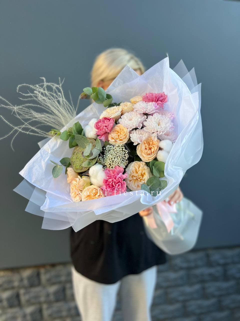 Состав: лотос, хризантема, диантус, хлопок, озатамус, пионовидная кустовая роза, эвкалипт, ковыль, оформление.
