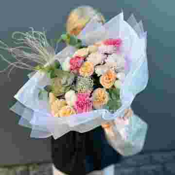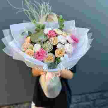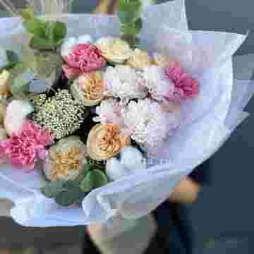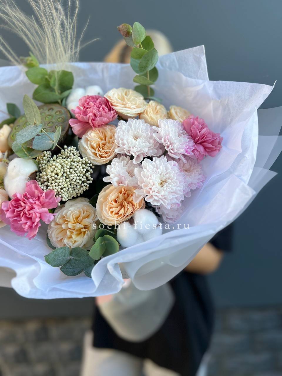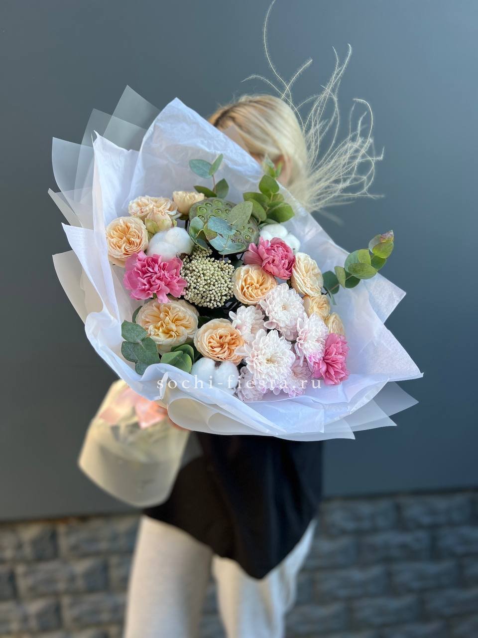 Состав: лотос, хризантема, диантус, хлопок, озатамус, пионовидная кустовая роза, эвкалипт, ковыль, оформление.