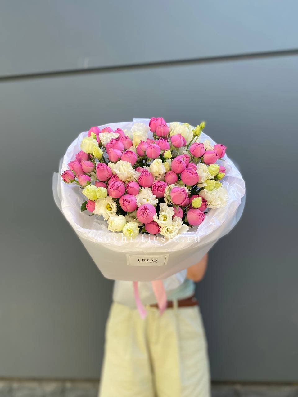 Авторский букет в составе которого кустовые розы, эустомы, лента и дизайнерская пленка.