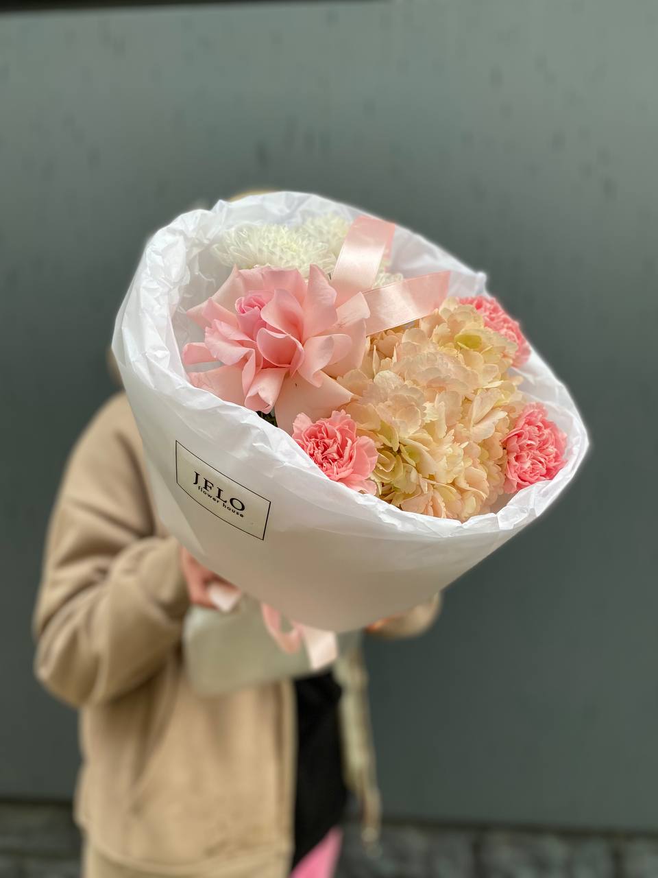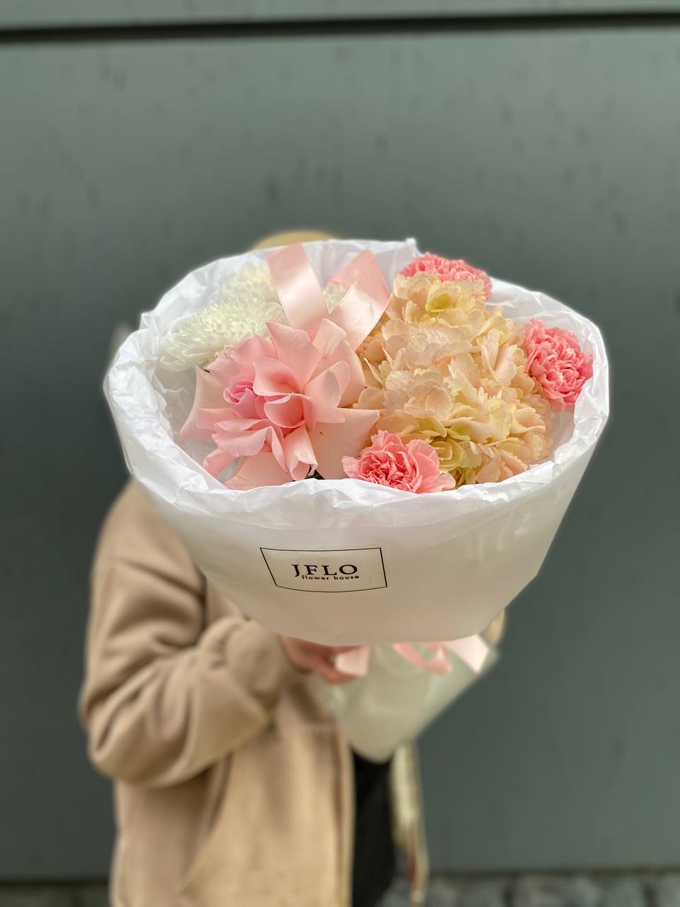 гортензия, хризантема, роза, диантусы, пленка.