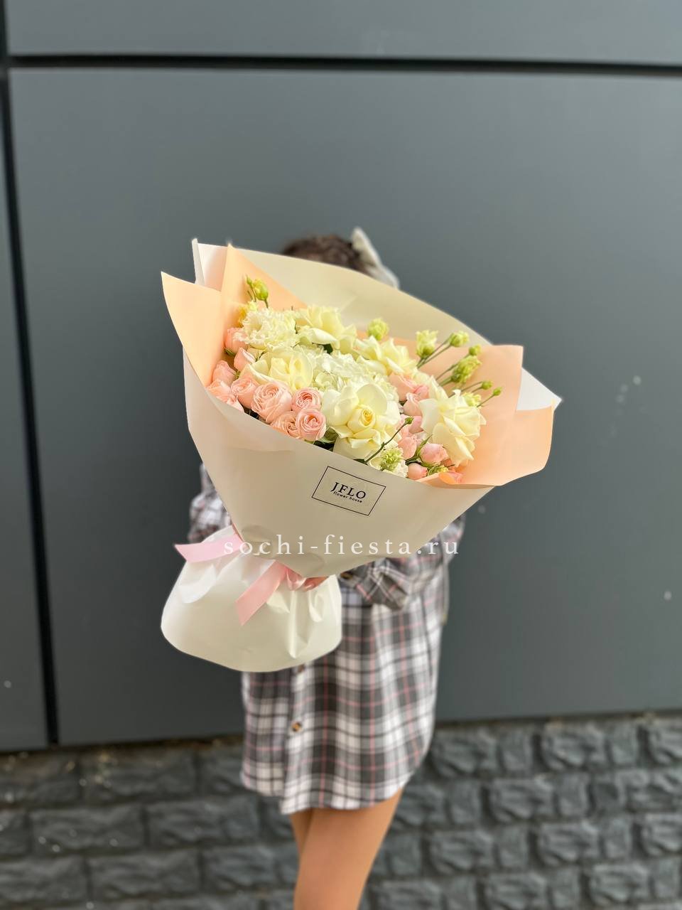 Состав: гортензия, белая роза, эустома, бомбастик в оформлении