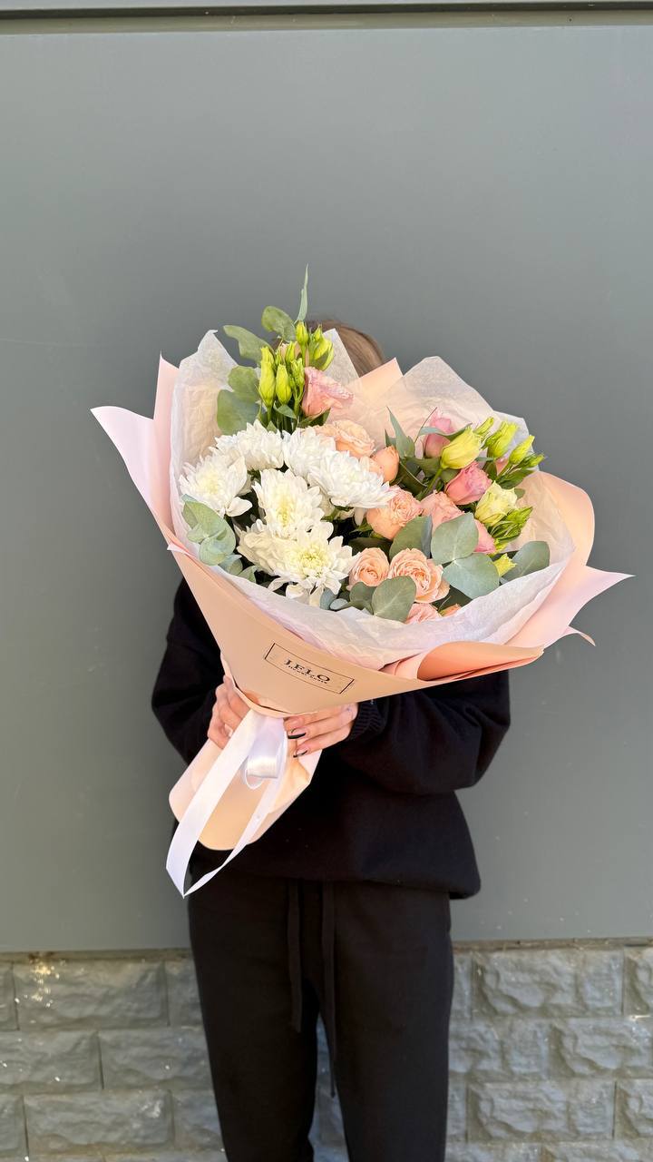 бомбастик, хризантема, эустома, эвкалипт, пленка.