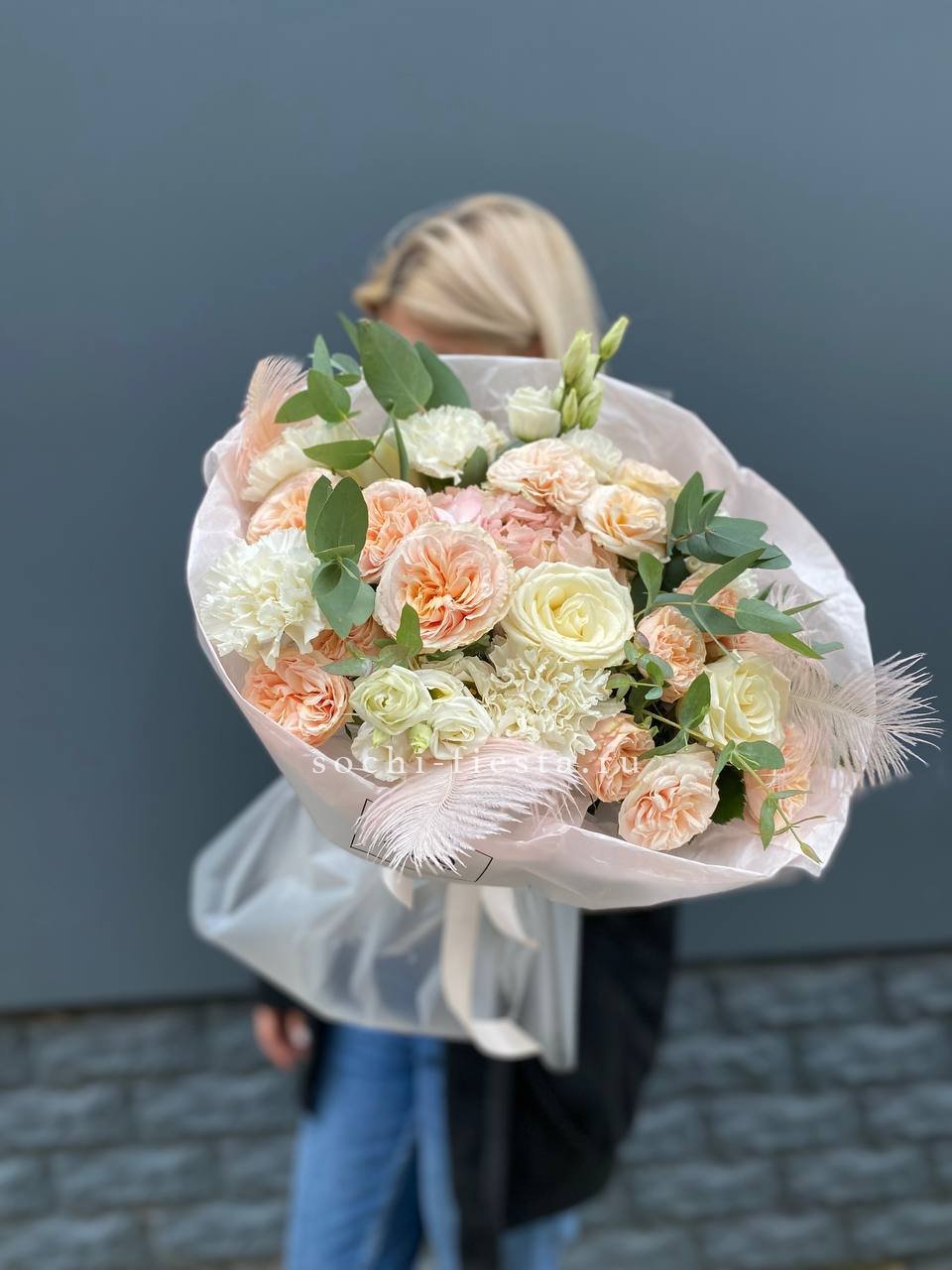 Состав: эвкалипт, гортензия, перо, кустовая роза, эустома, роза белая, диантус, упаковка