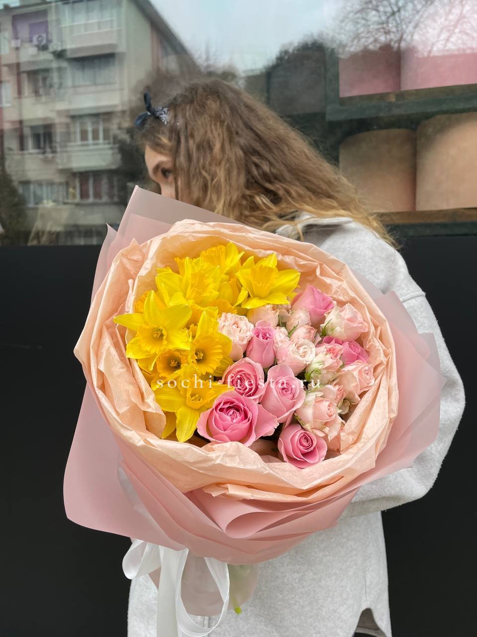 Состав: нарцисс, роза, пионовидная роза, авторское оформление
