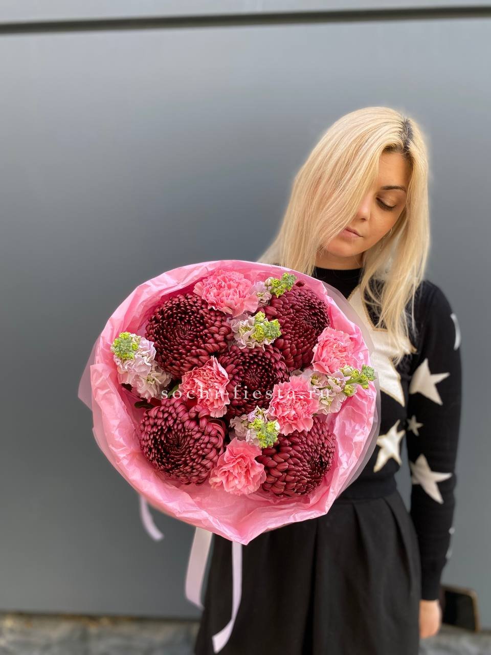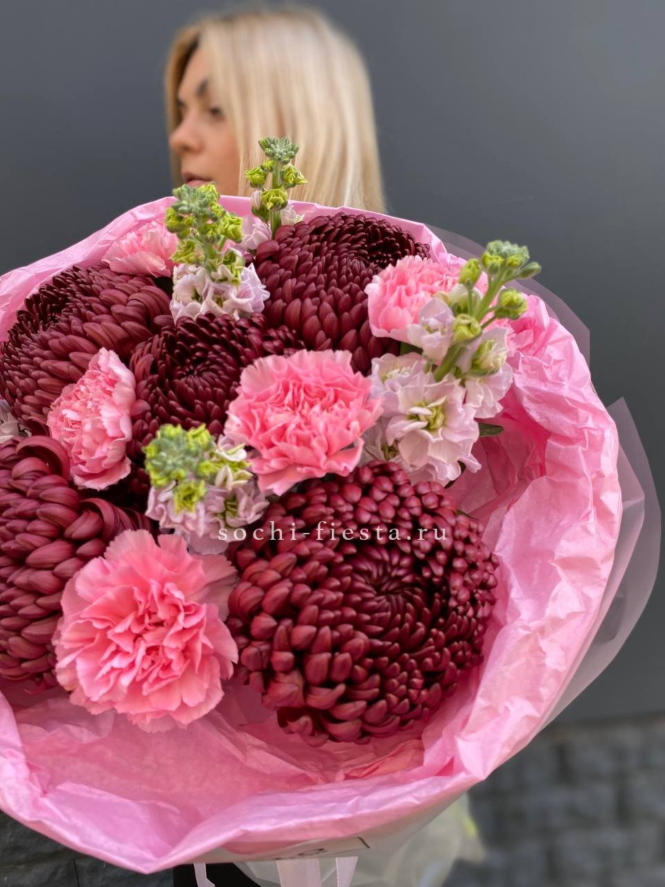 Состав: бигуди, диантусы, маттиола в нежном оформлении