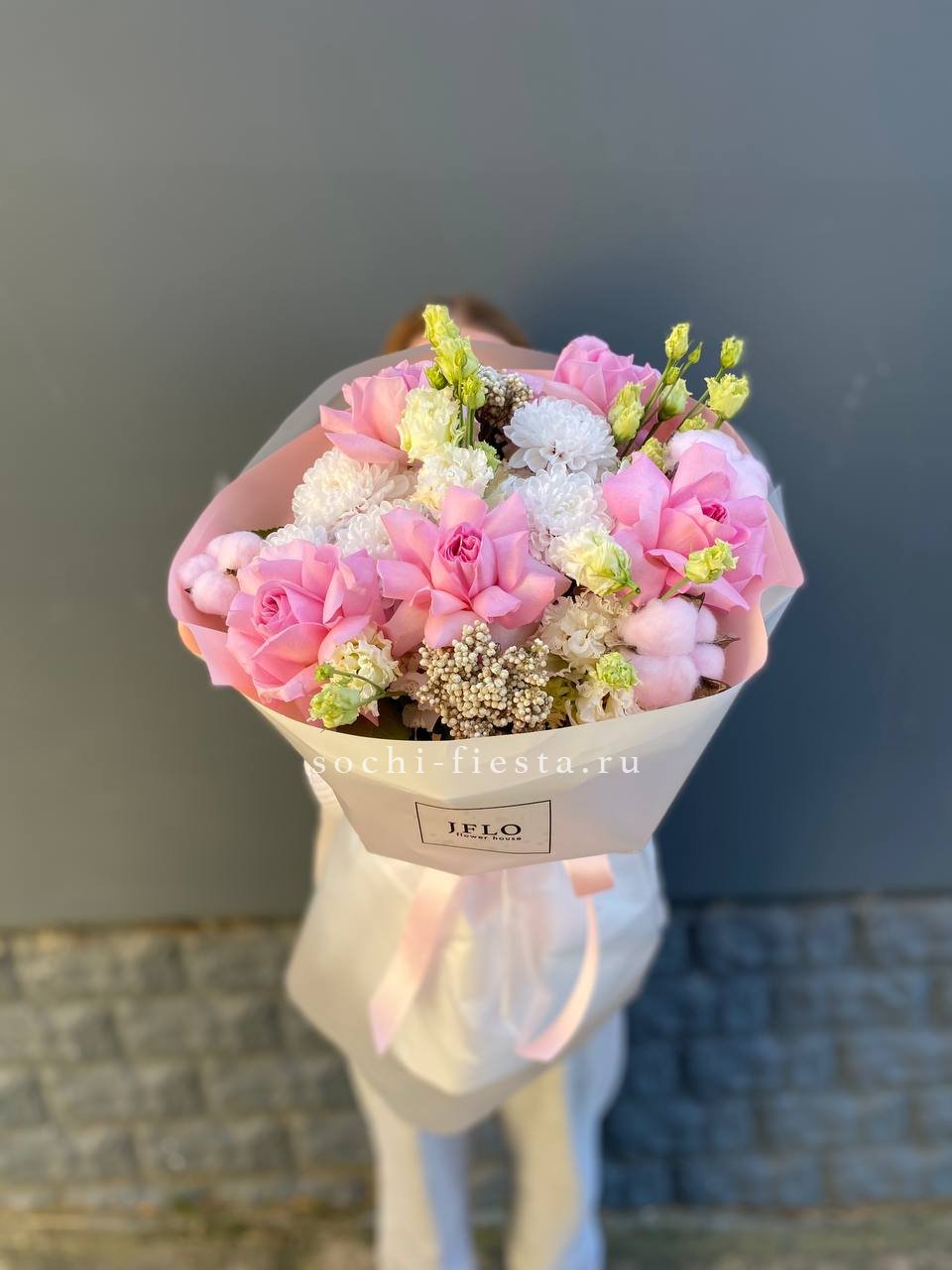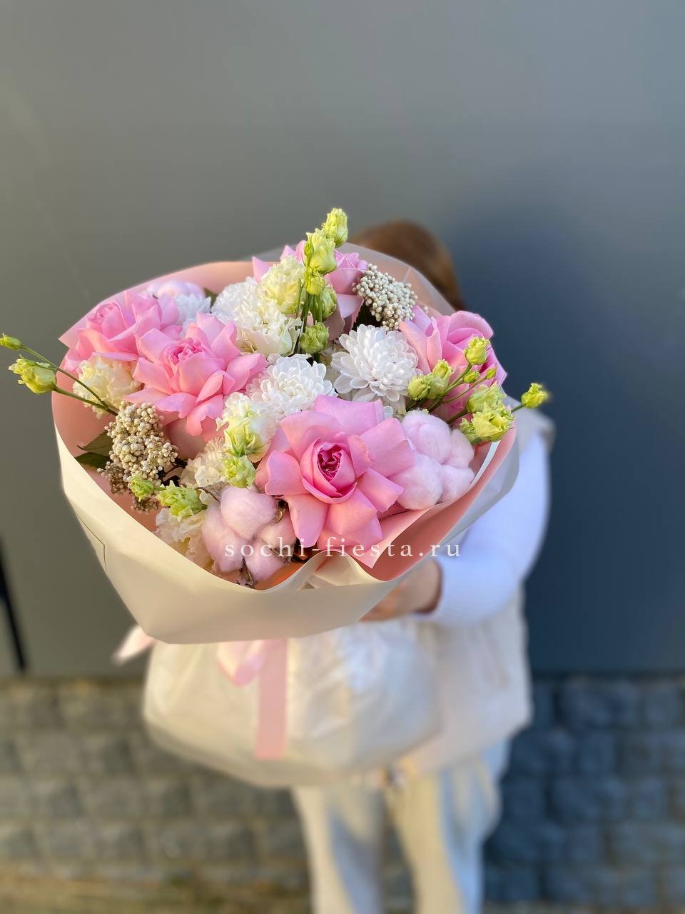 Состав: хризантема, эустома, озотамус, розы, хлопок в оформлении