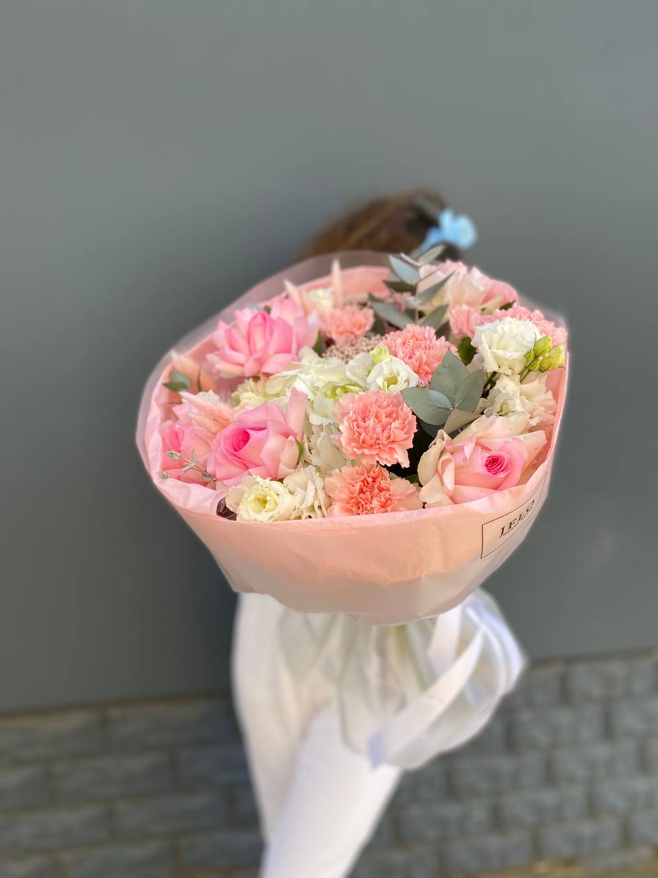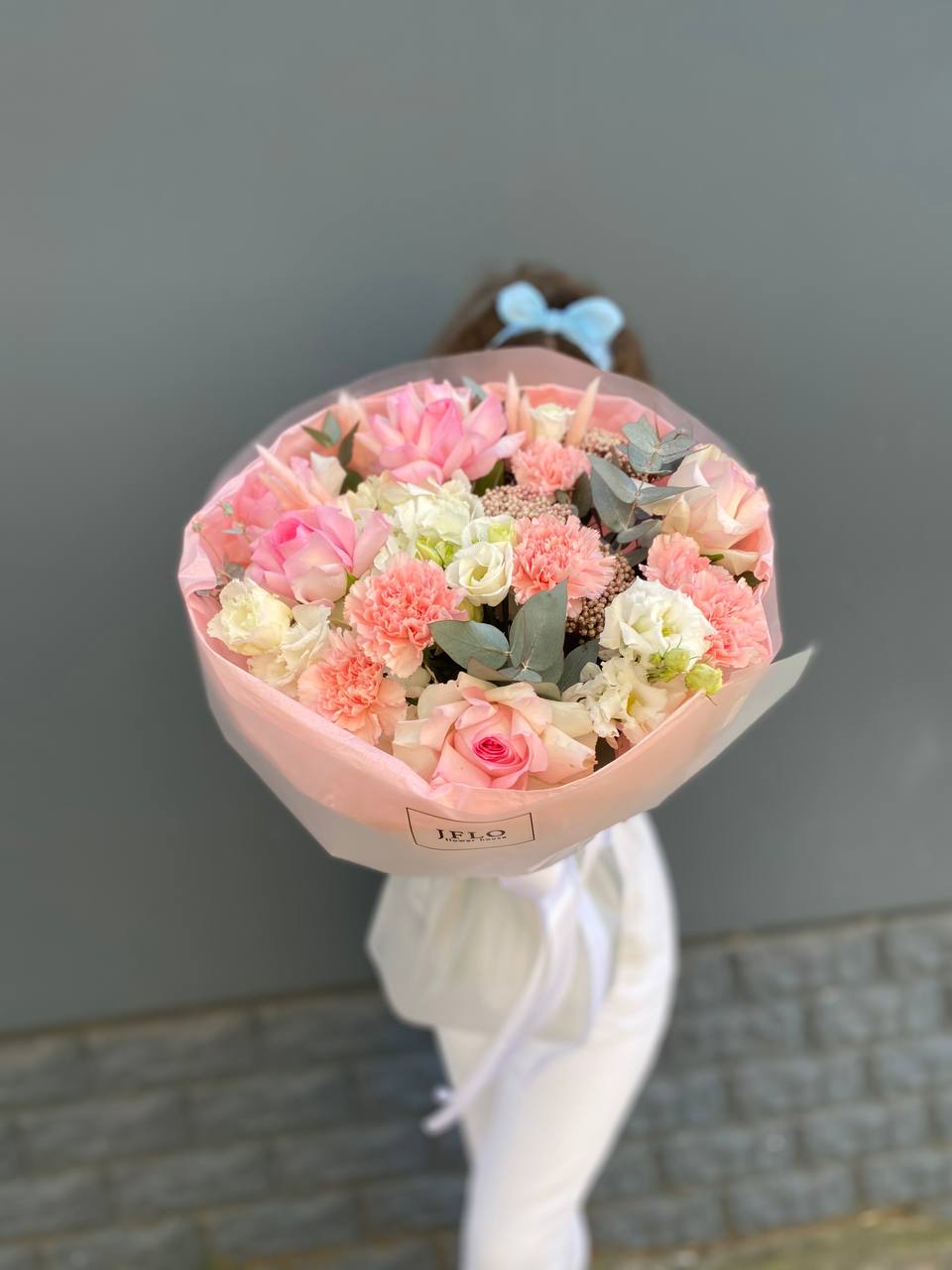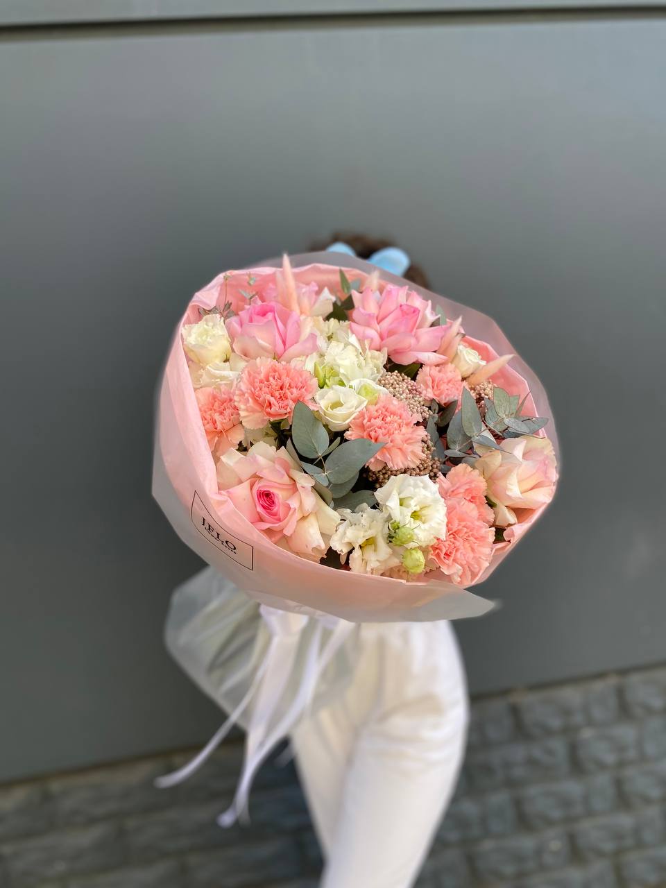 Плотная сборка с пышной гортензией в центре и рассыпчатыми соцветиями диантуса по краям. Эустома добавляет воздушности, а ветки озатамуса создают лёгкую графику. Букет держит форму и выглядит объёмно с любого ракурса.