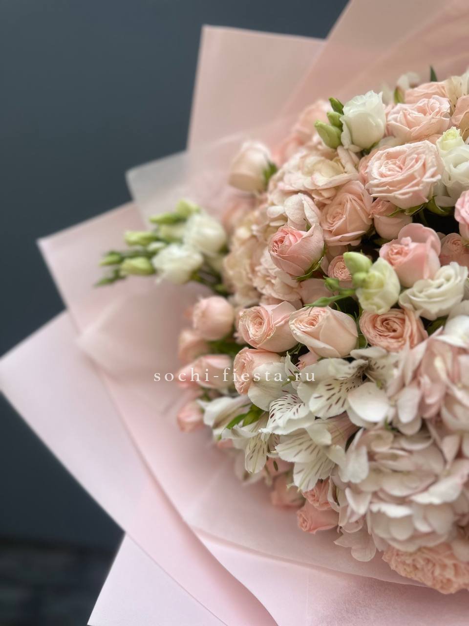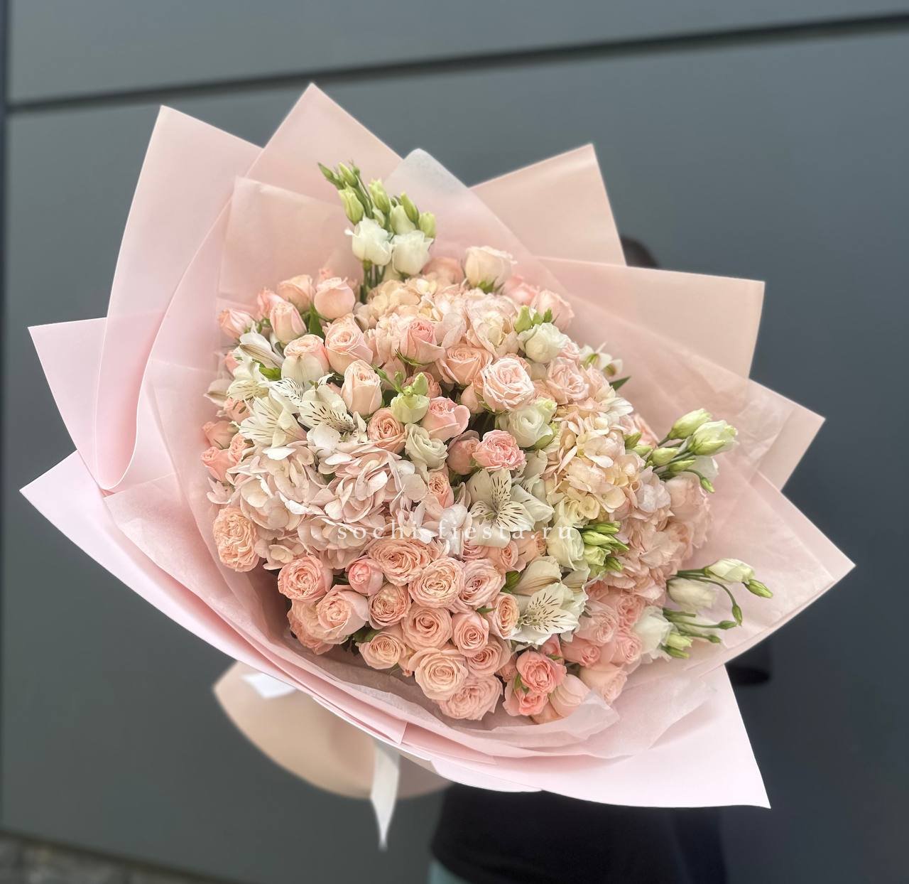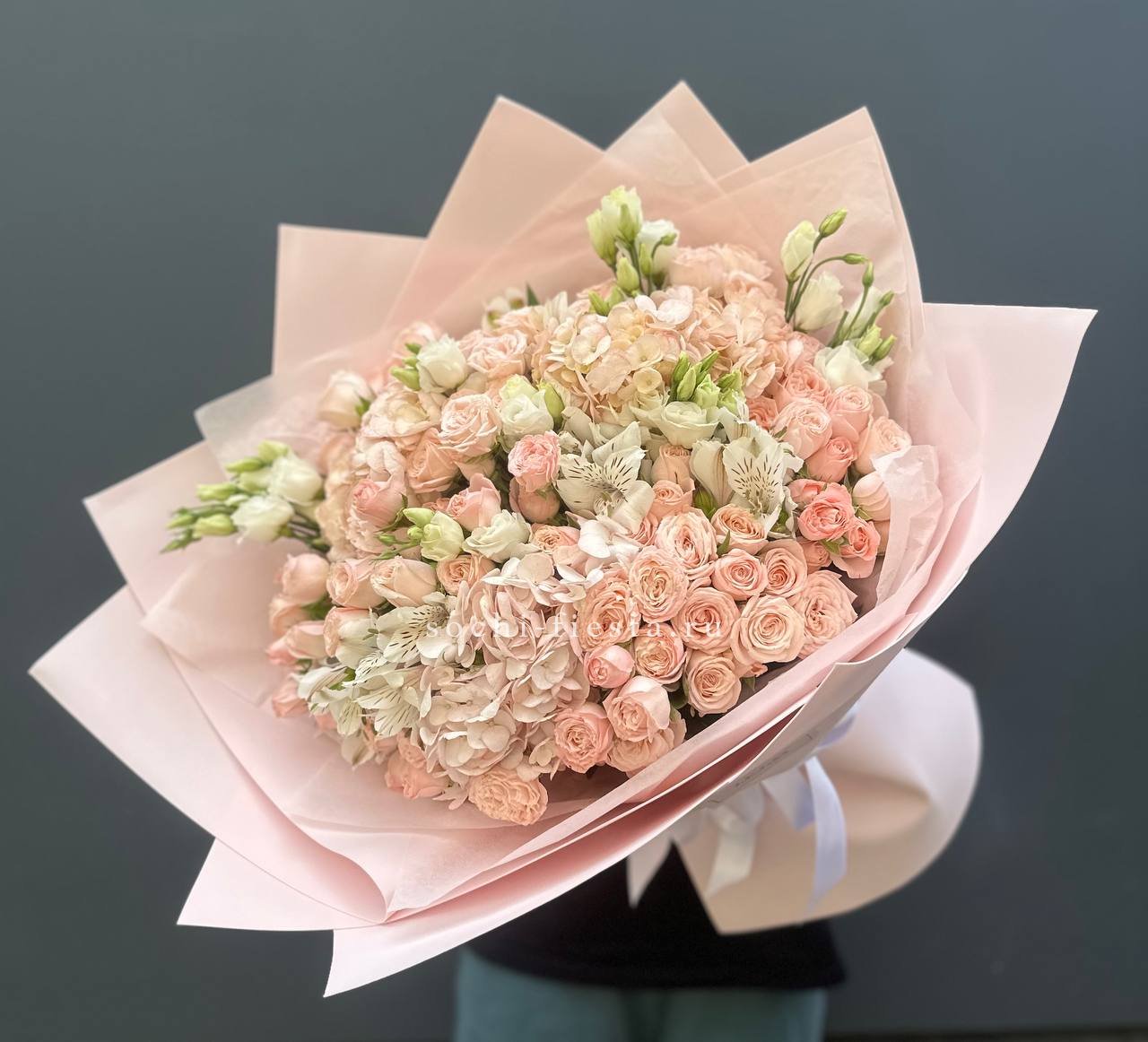 Авторский букет в составе которого:  кустовые розы, эустомы, гортензии, альстромерии, лента и дизайнерская пленка.