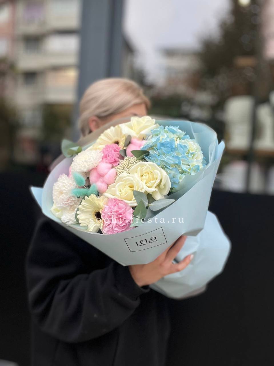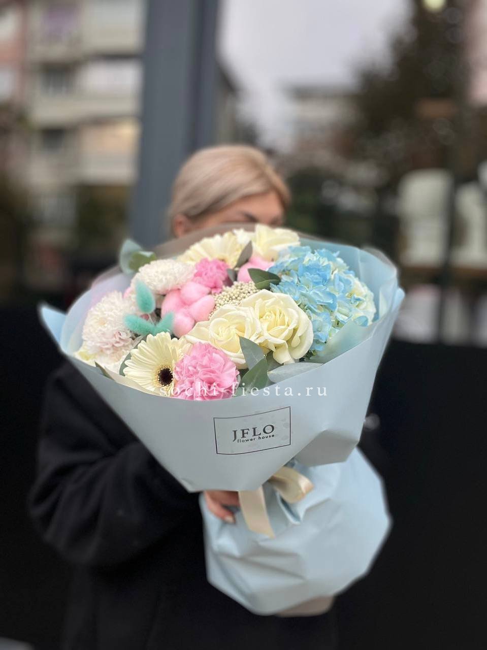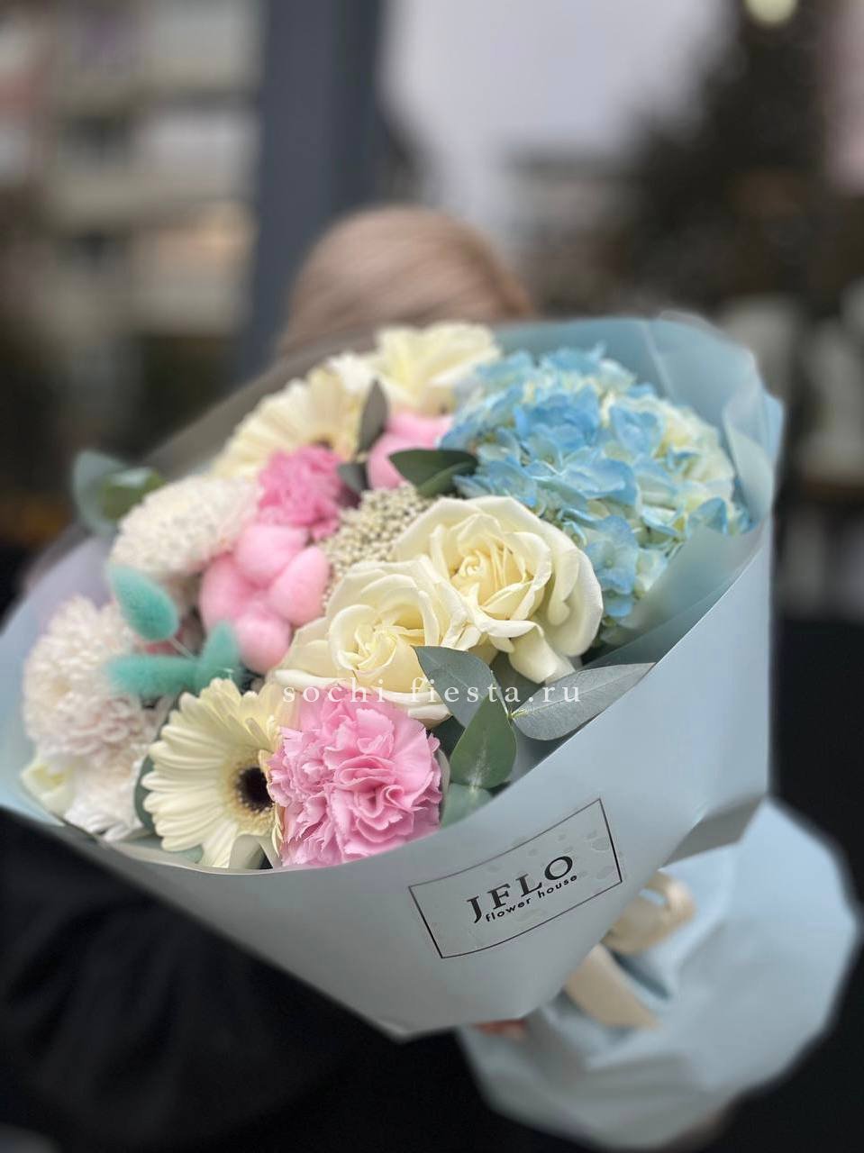 Состав: гербера, роза, диантус, гортензия, хлопок, хризантема, озатамус, упаковка