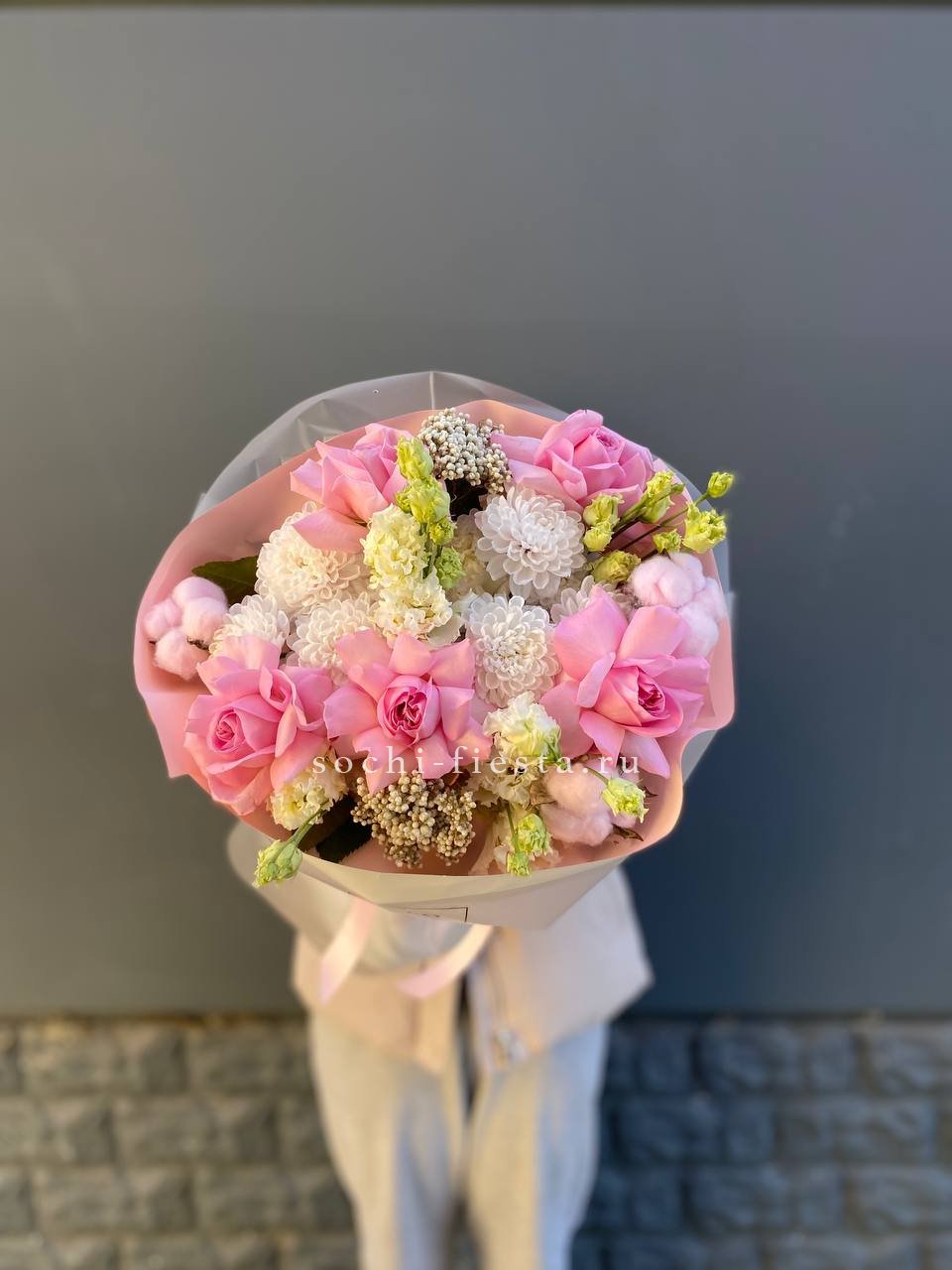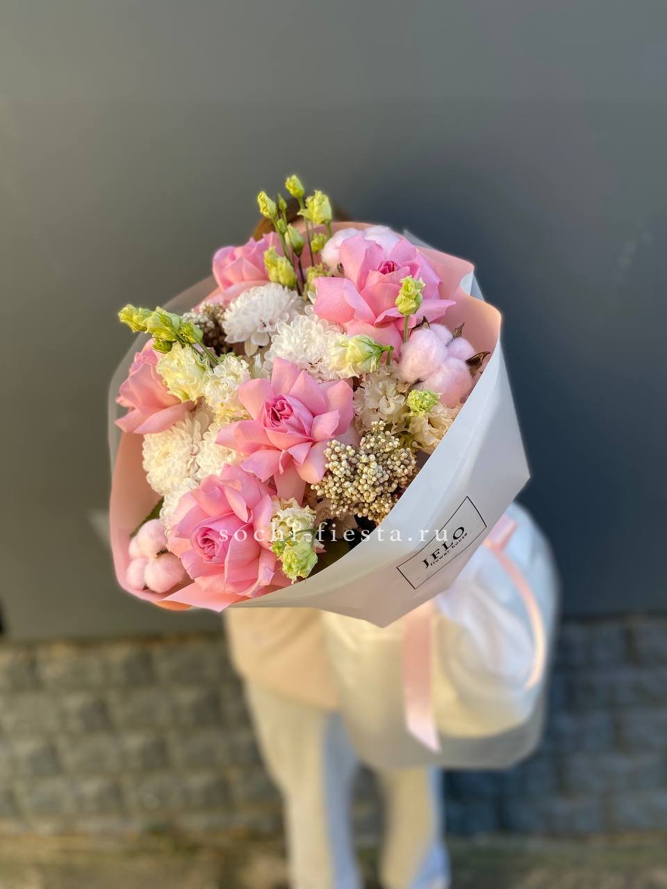 Состав: пионы (или аналог вне сезона), лимониум, маттиола, мисти баблс, эустома, эвкалипт, лента, упаковка