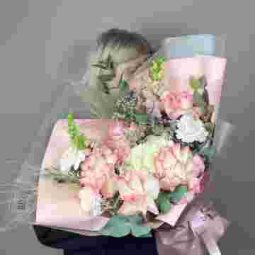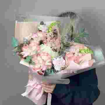 Состав: пионы (или аналог вне сезона), розы, гортензия, кустовые розы, эустома, маттиола, декоративная зелень, лента, дизайнерская пленка