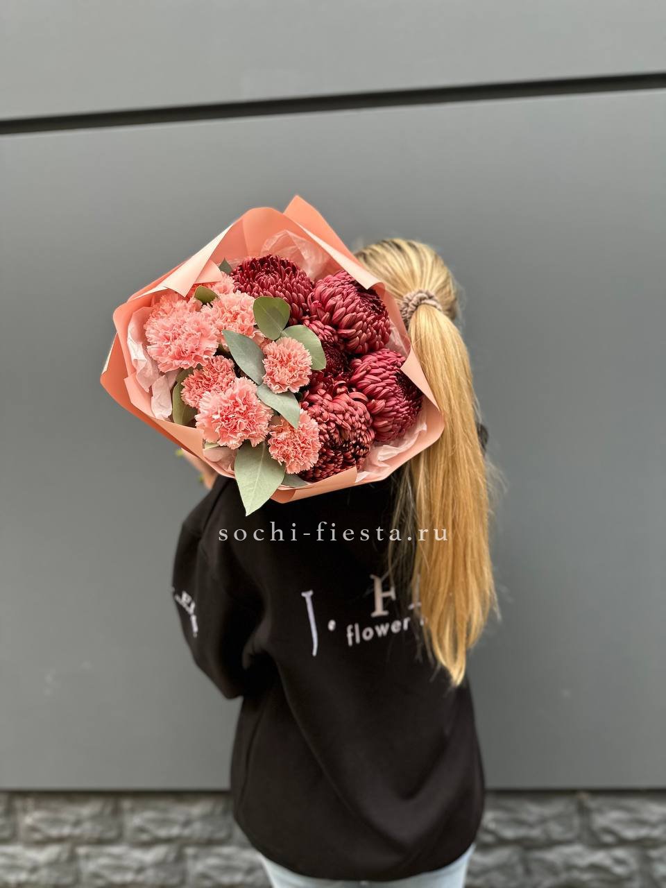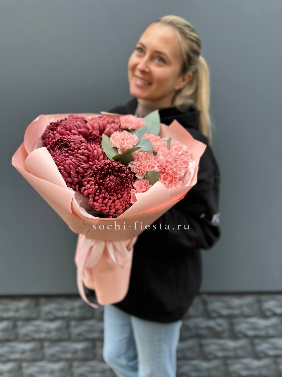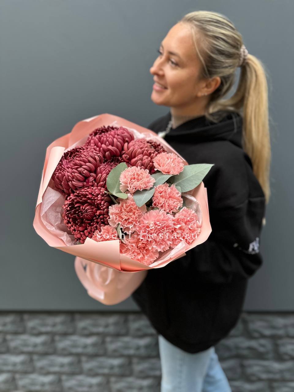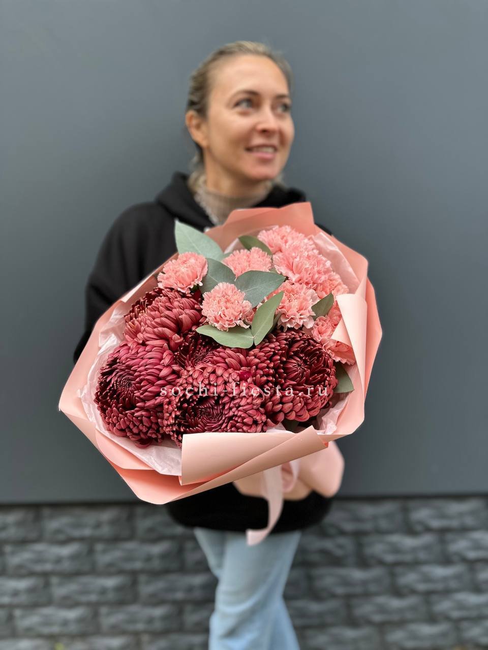 Состав: букет дуо диантусы и бигуди с эвкалиптом в оформлении