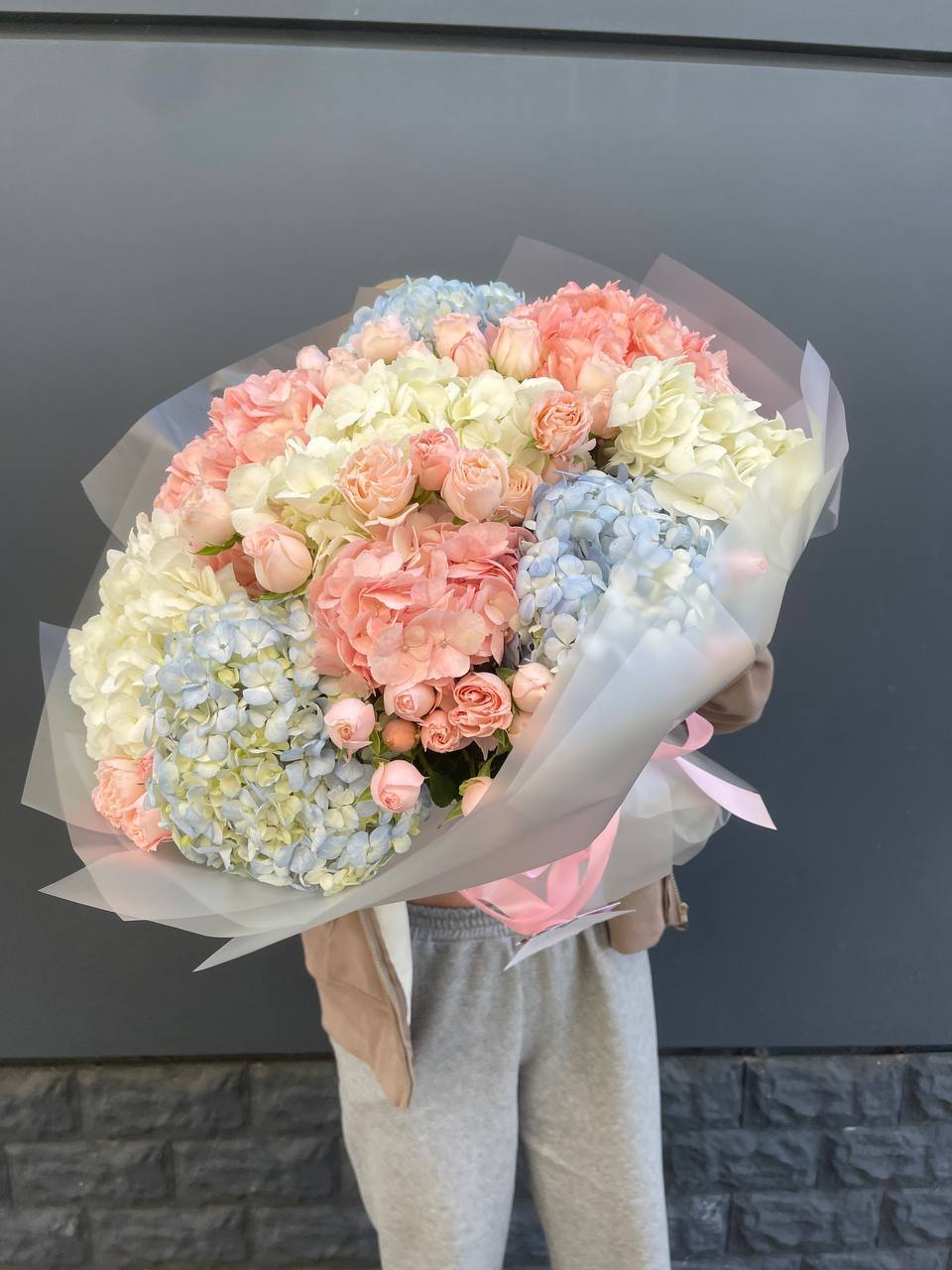 Этот пышный авторский букет напоминает нежное зефирное облако, в котором гармонично сочетаются объемные формы и изысканные оттенки. Композиция представляет собой микс из крупных соцветий гортензии и кустовых роз в пастельной гамме.