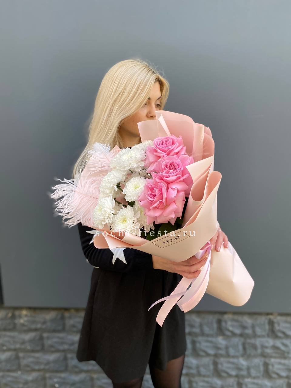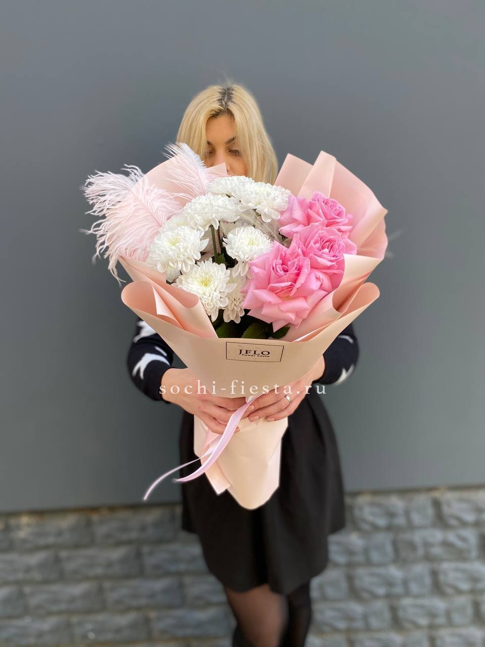 Состав: хризантема кустовая, розовые розы, перо, ковыль в оформлении