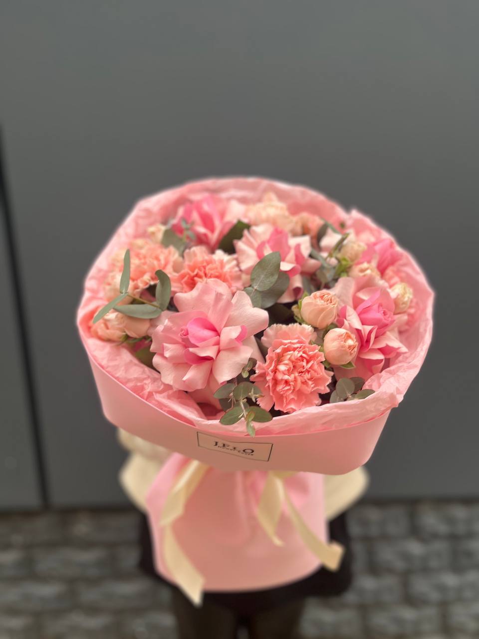 Диантусы и кустовые розы создают воздушную композицию с мягкими переходами оттенков. Бутоны распределены свободно, образуя естественный силуэт без жесткой геометрии. Букет хорошо держит форму и долго сохраняет свежесть.
