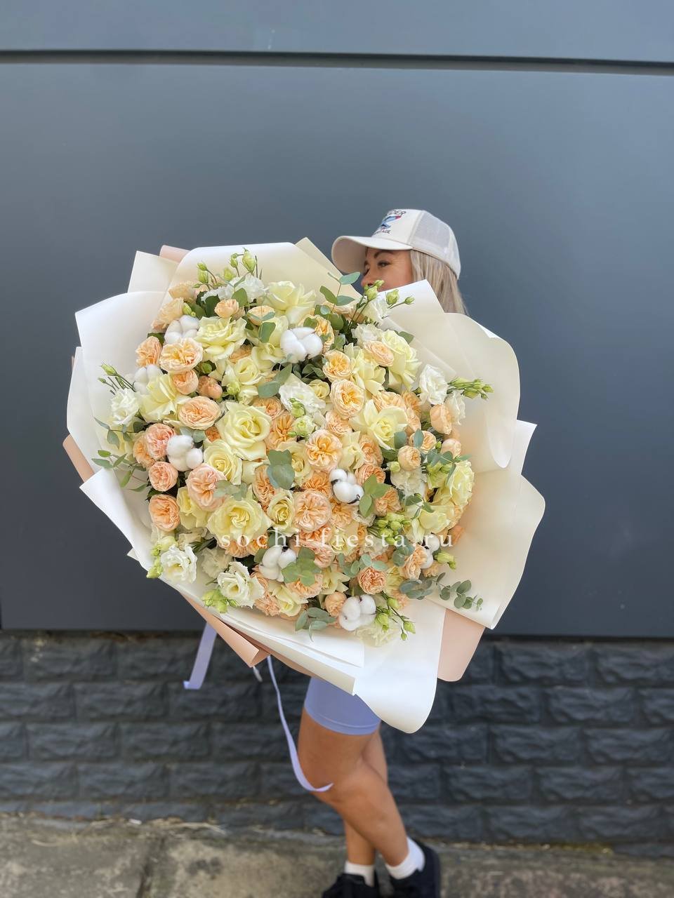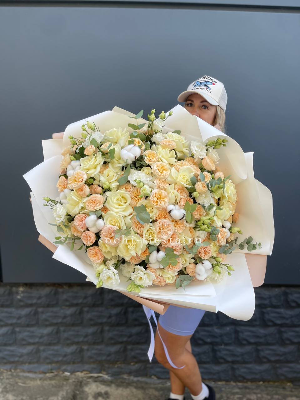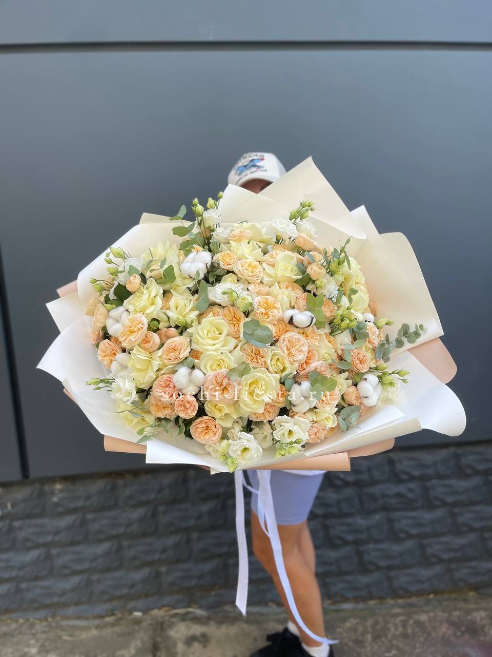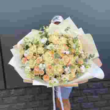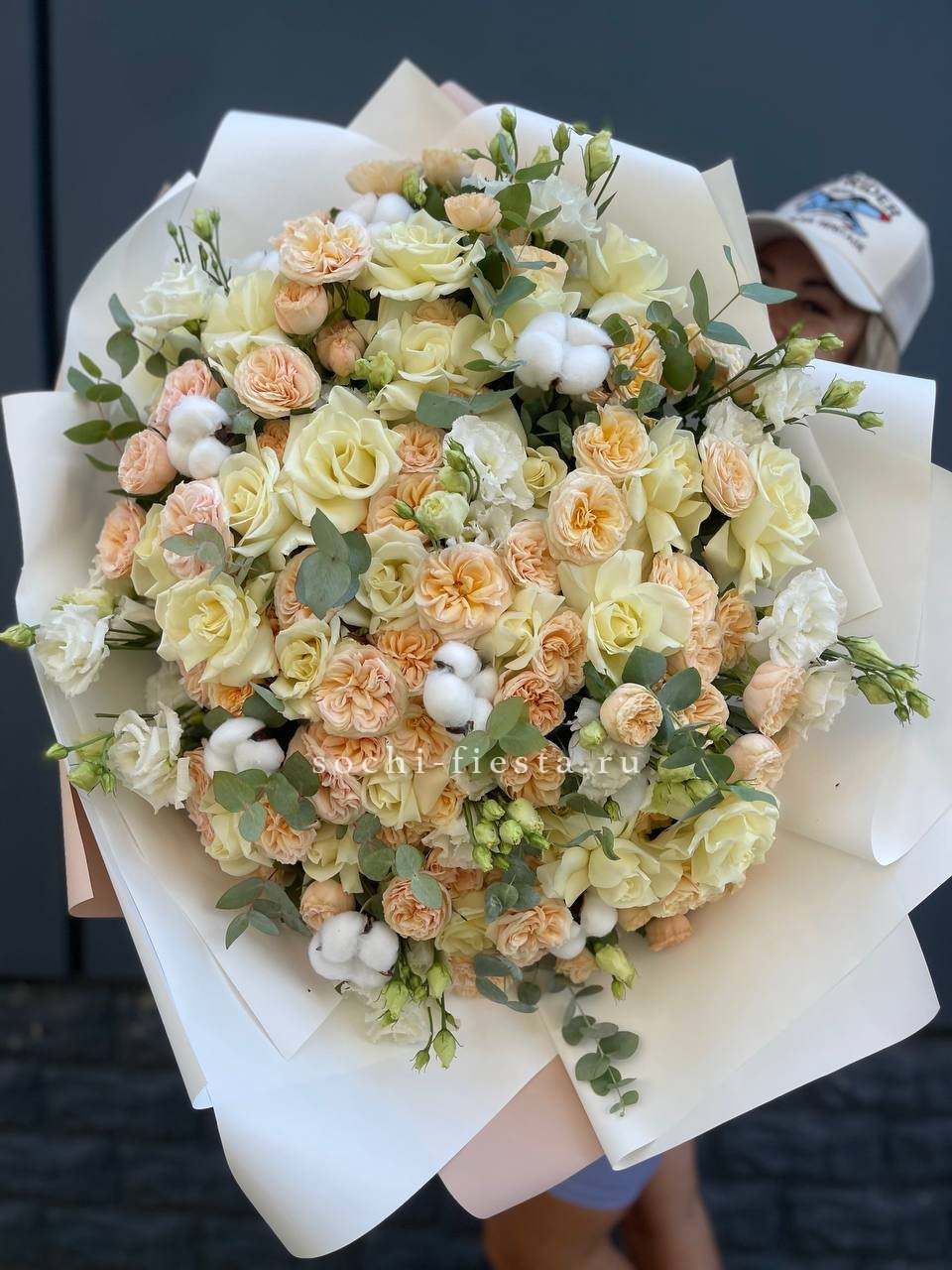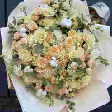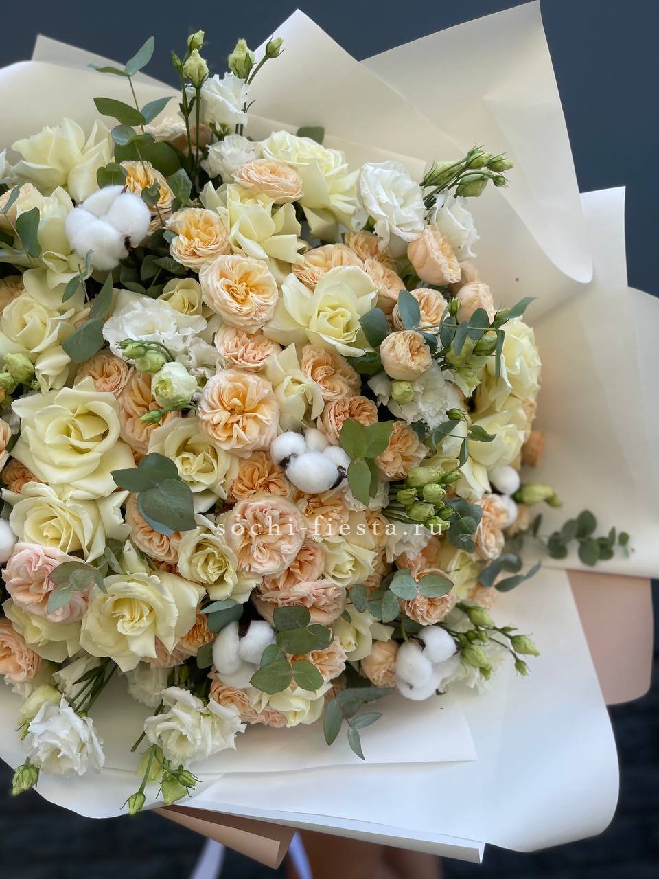 Состав: эустома, пионовидная кустовая роза, белая роза, хлопок, эвкалипт, оформление.
