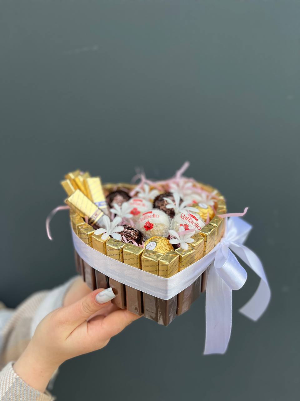 Состав: шоколад мерси, ферреро, рафаэло с искуственными цветочками в коробочке сердце