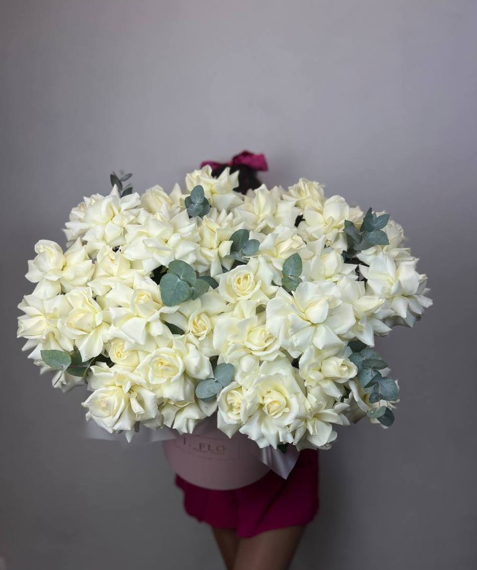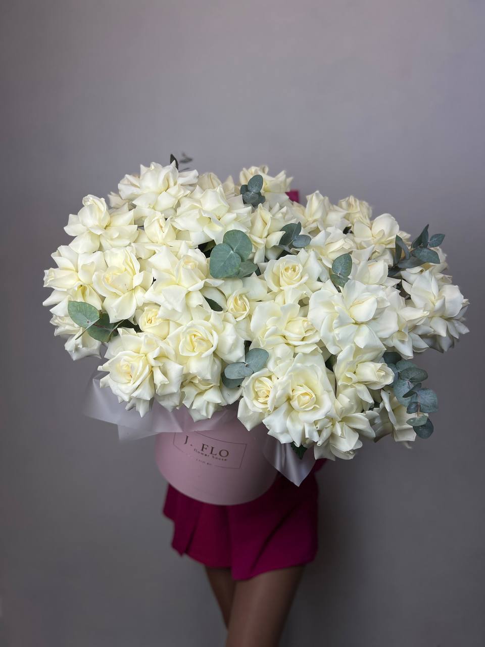 Тридцать одна роза в коробке-сердце создаёт объёмное облако из белых и пудровых бутонов. Плотная сборка и мягкие переходы оттенков формируют цельный романтичный образ.
