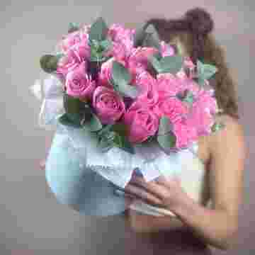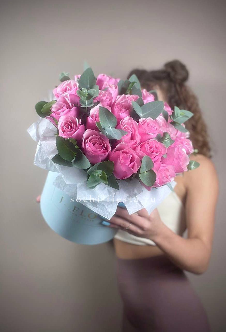 Состав на фото 27 розовых роз в шляпной коробке с эвкалиптом.