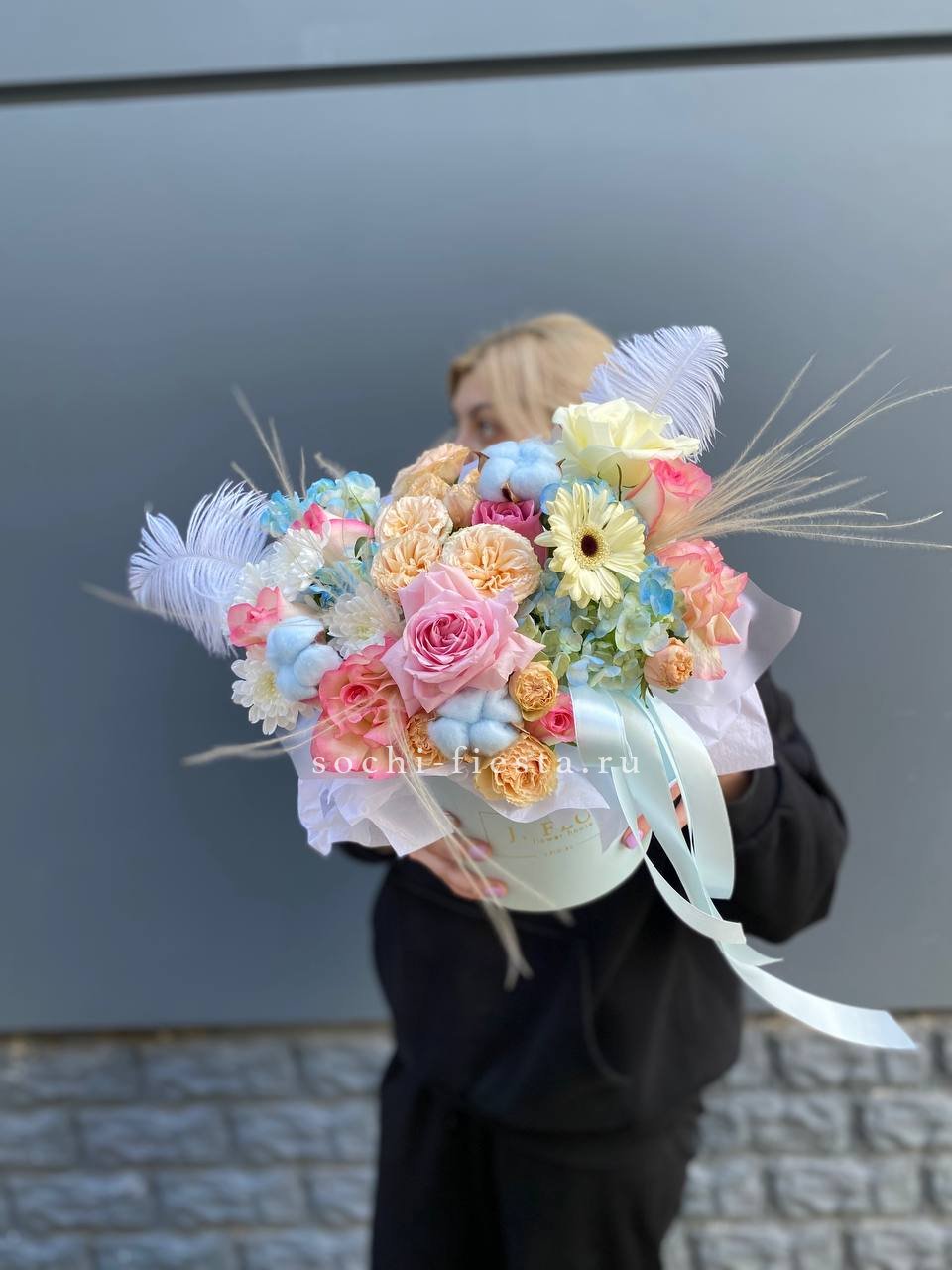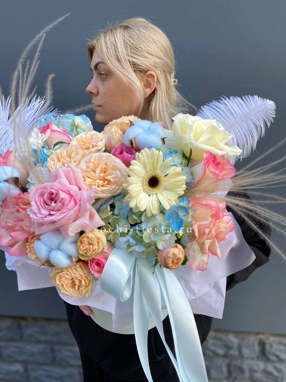 Состав: бокс из нежных розово-голубых цветов, розы, герберы, гортензии.