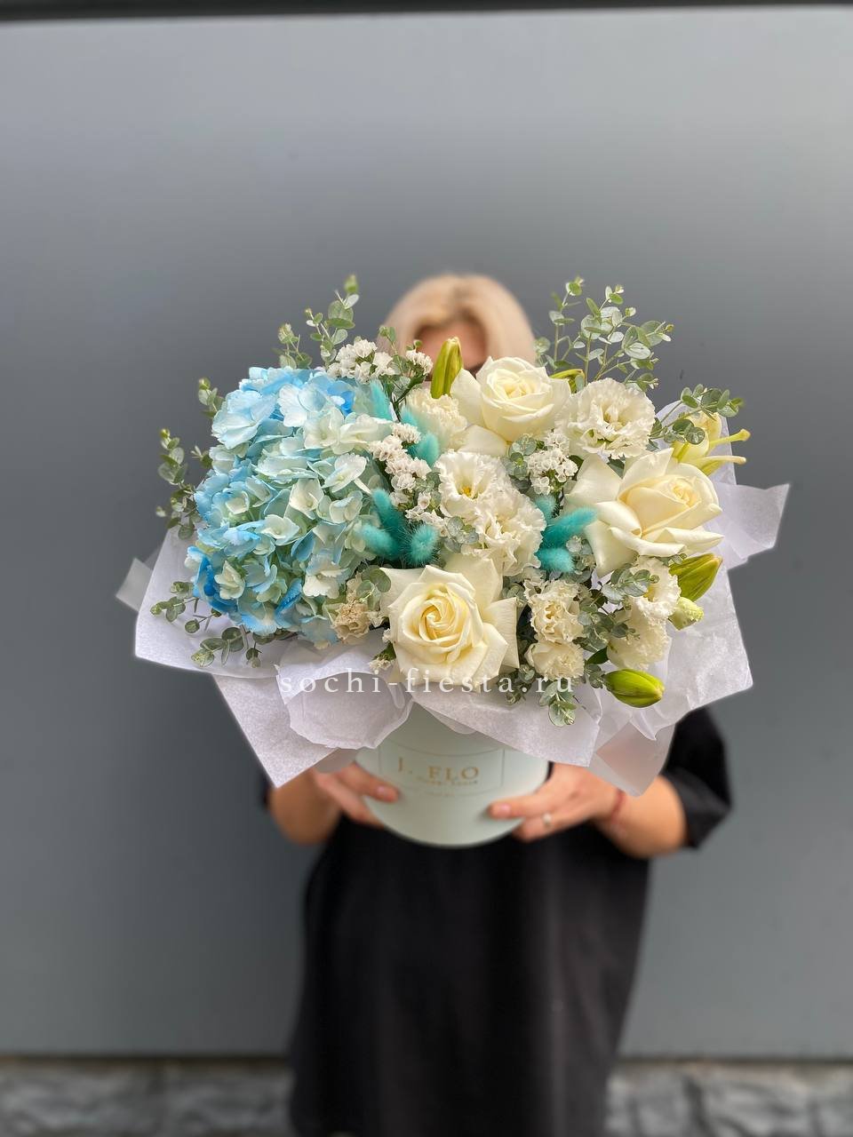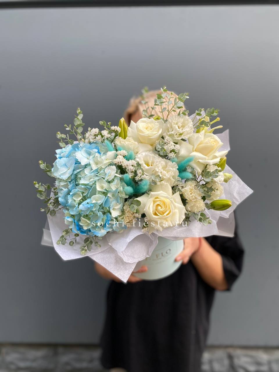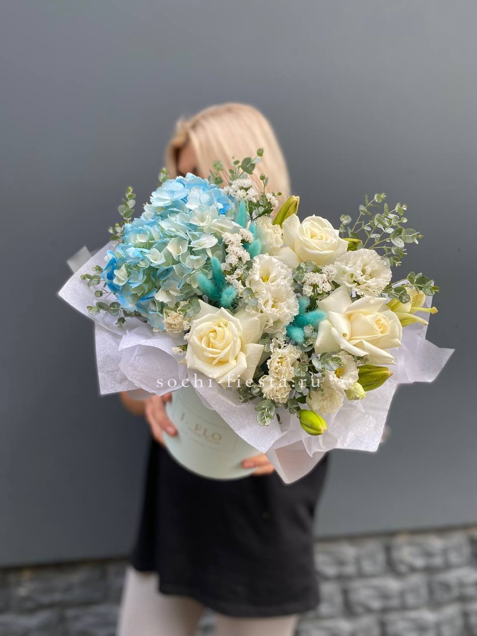 Состав: бокс 16, гортензия, роза, эустома, лилия, статица, лагурус