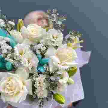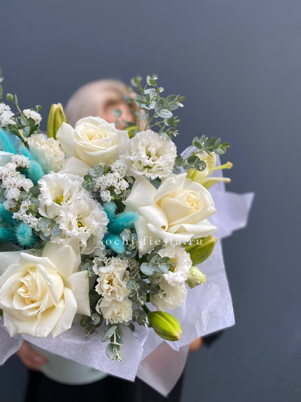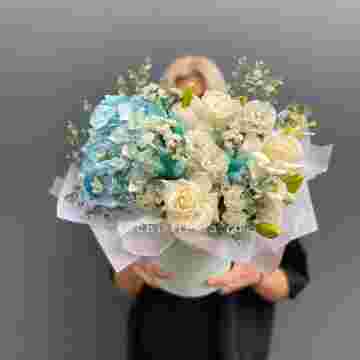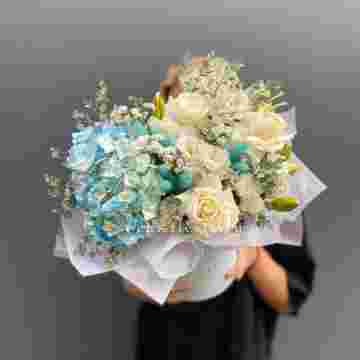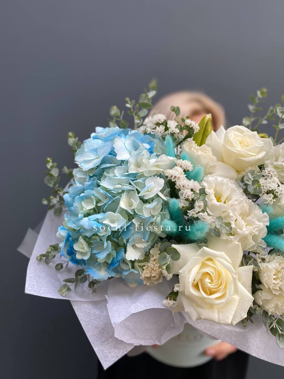 Состав: бокс 16, гортензия, роза, эустома, лилия, статица, лагурус