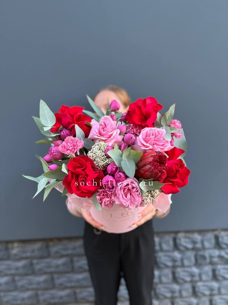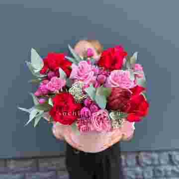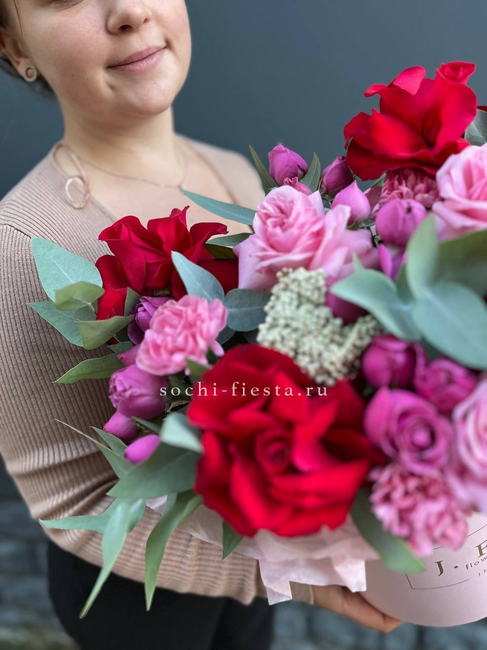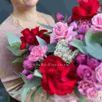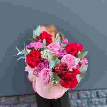 Состав: красная и розовая роза, озатамус, диантус, мисти баблс, эвкалипт, бокс 20