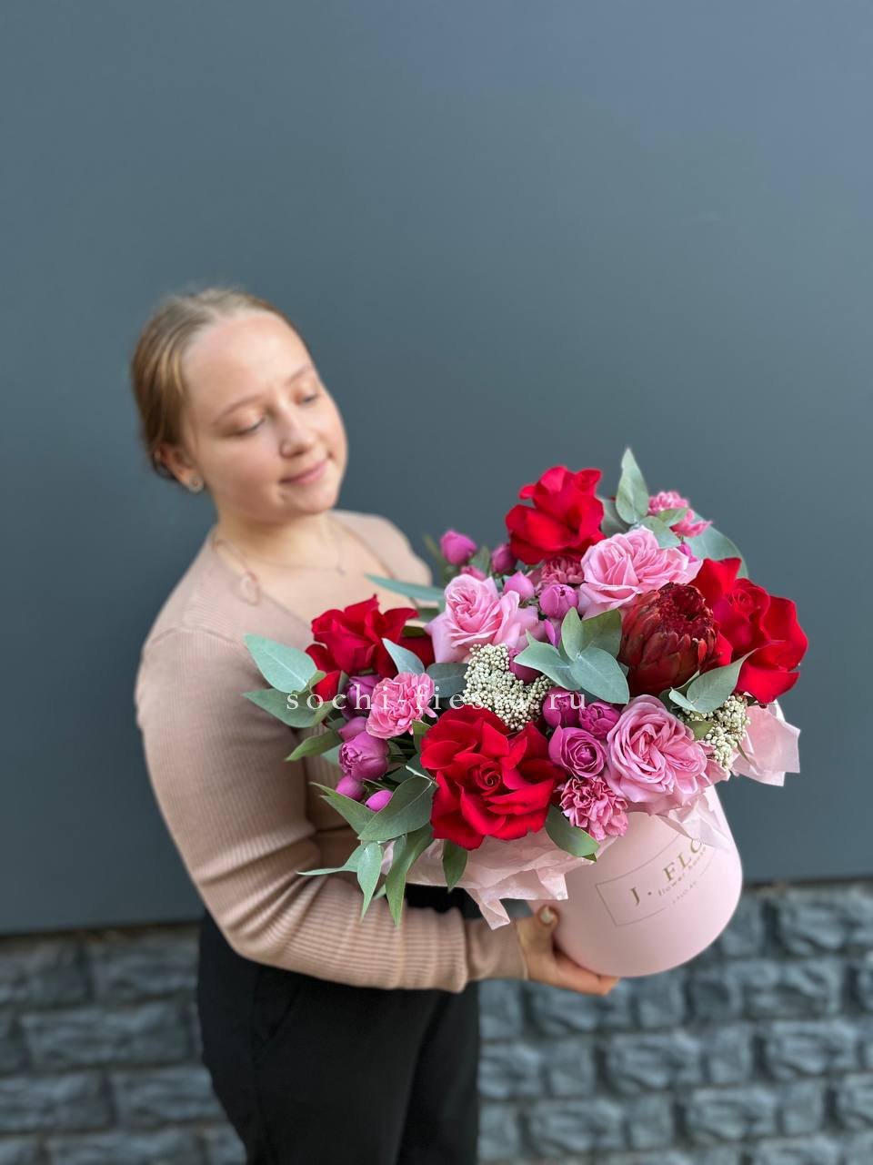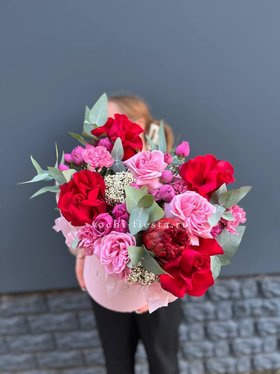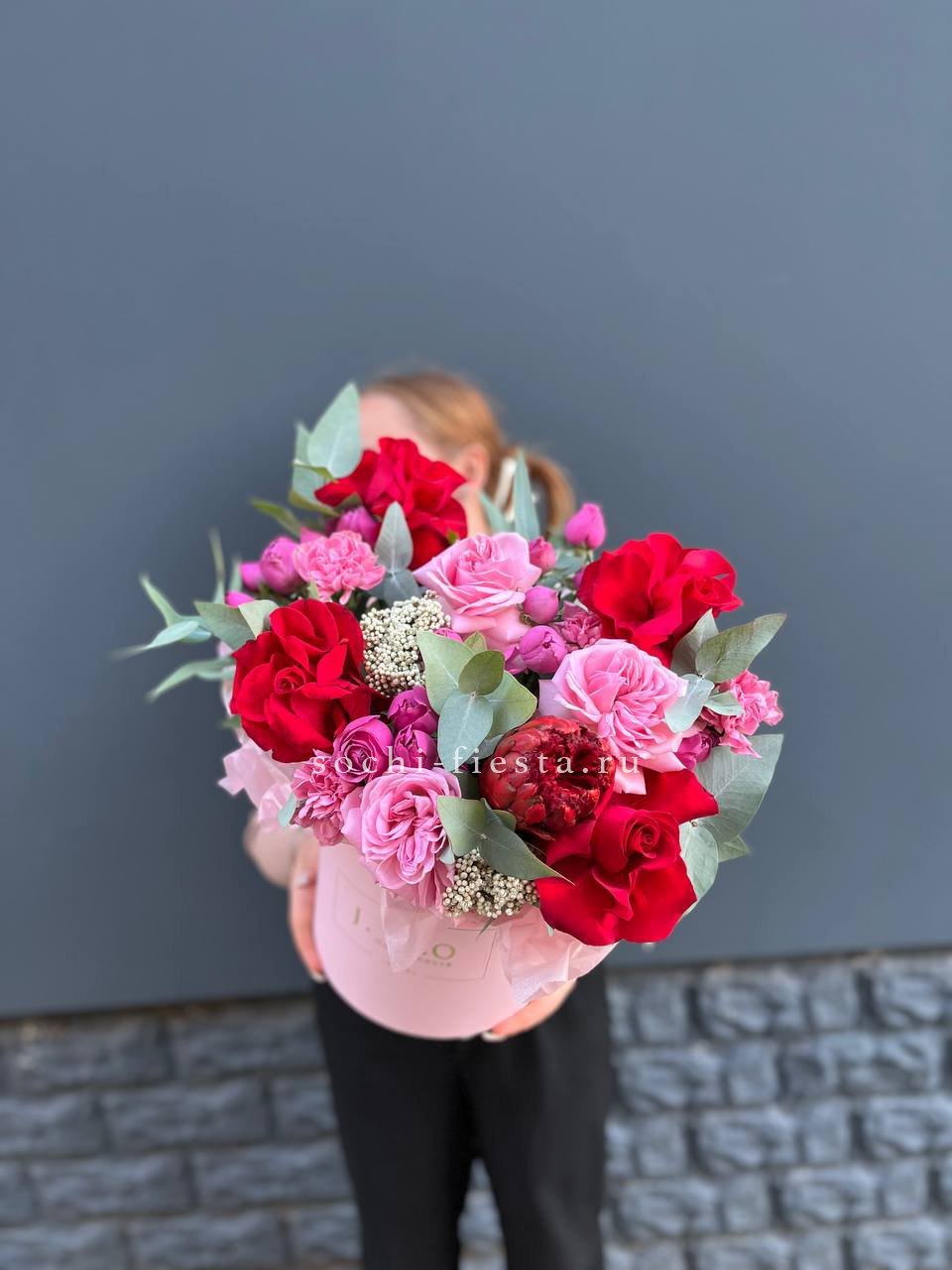 Состав: красная и розовая роза, озатамус, диантус, мисти баблс, эвкалипт, бокс 20