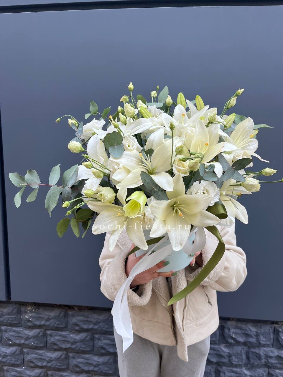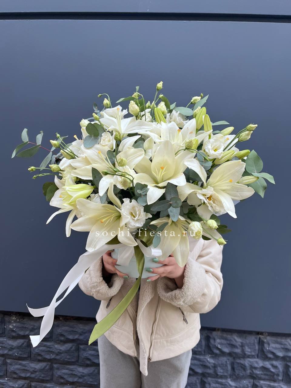 Состав: эустома и лилии в боксе 20 с эвкалиптом
