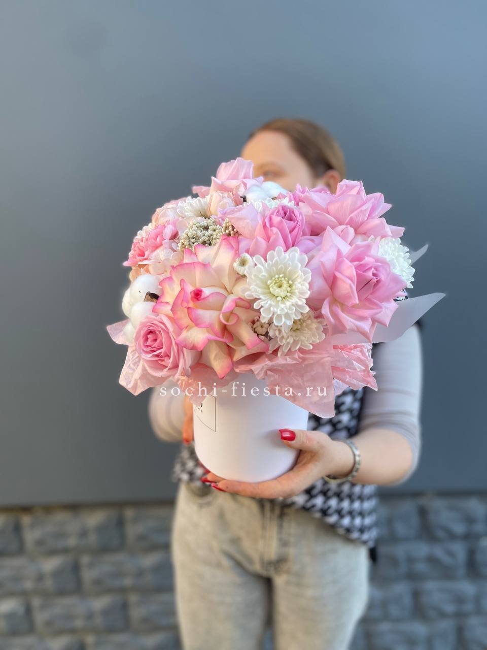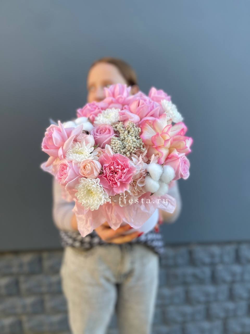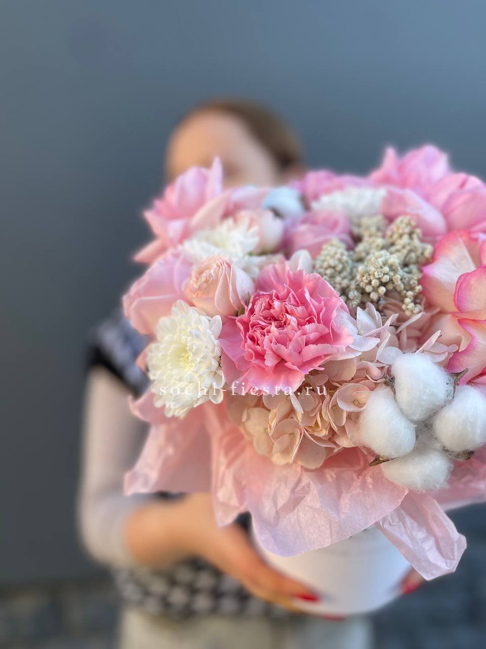 Состав: гортензия, розы, озотамус, диантус, бомбастик, хлопок, хризантема бокс 16