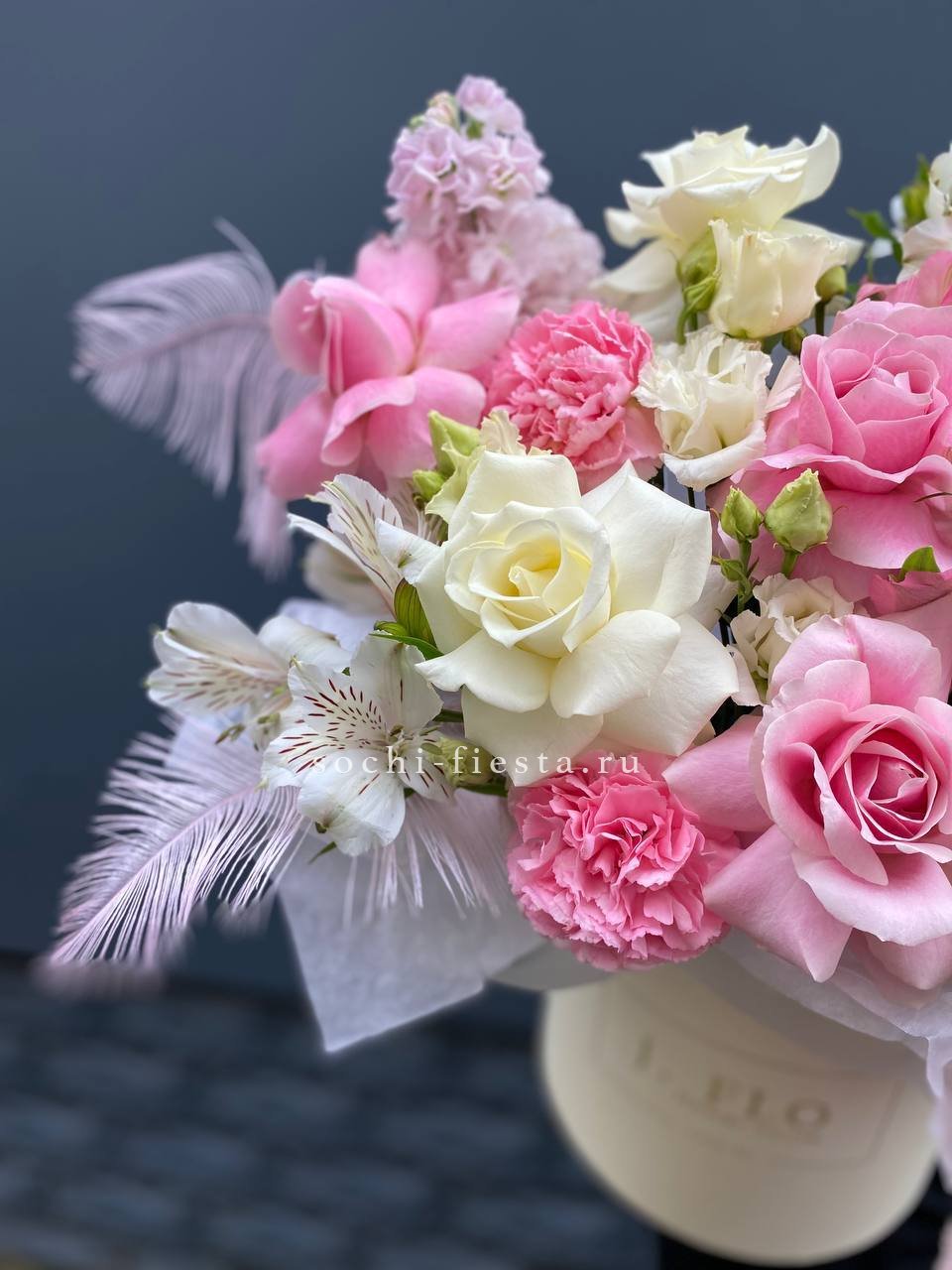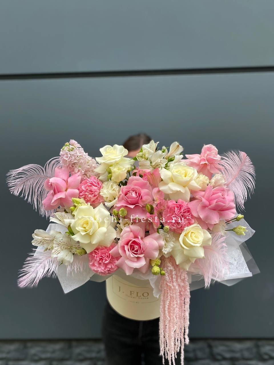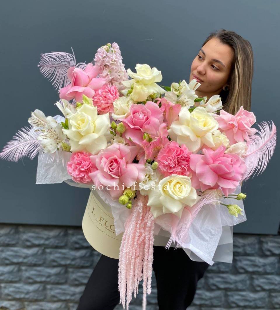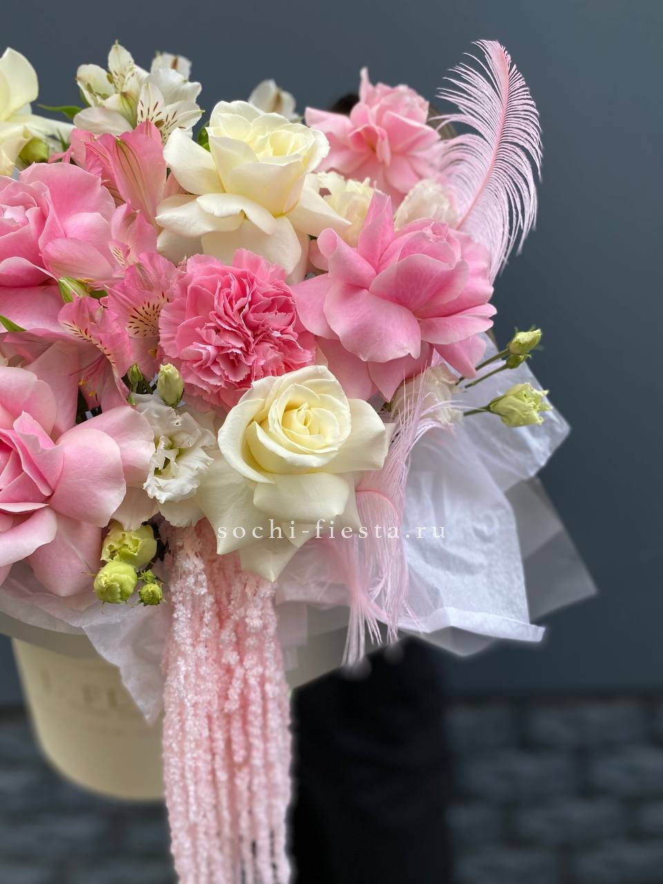 Дизайнерский бокс в составе которого: французские розы, альстромерии, маттиола, эустома, амарантус, перья