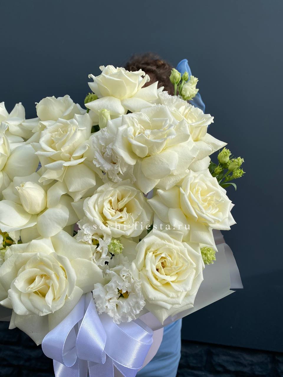 Состав: белые розы, эустома, цилиндр D13, эвкалипт, лента, упаковка.