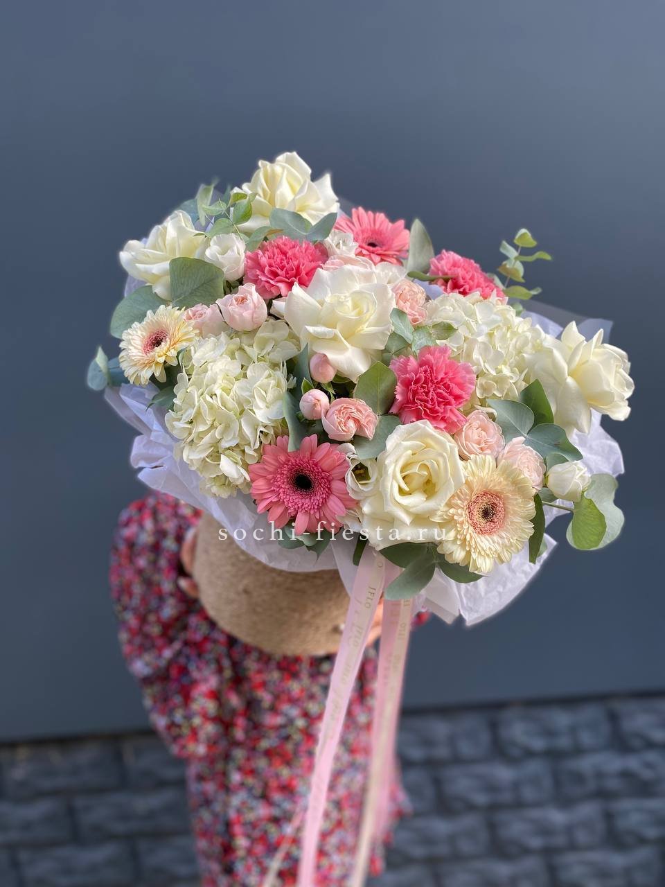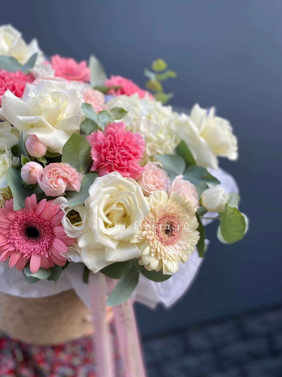 Состав: гербера, розы, диантус, бомбастик, гортензия, эустома, эвкалипт, джутовое кашпо