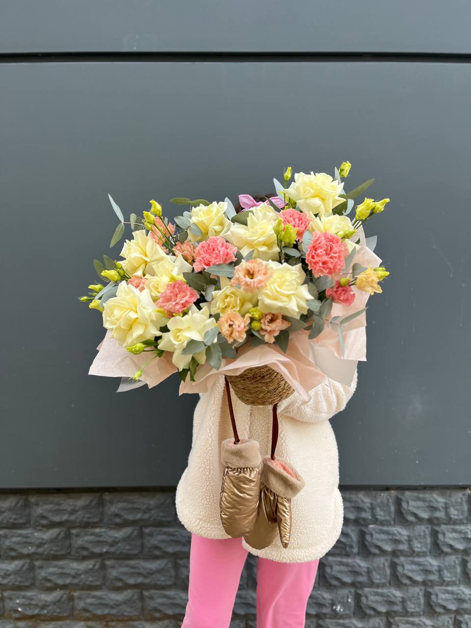 Воздушная композиция в натуральном джутовом кашпо с белыми розами и эустомой. Диантусы добавляют объема и делают форму округлой. Готовое решение для размещения на столе или комоде.