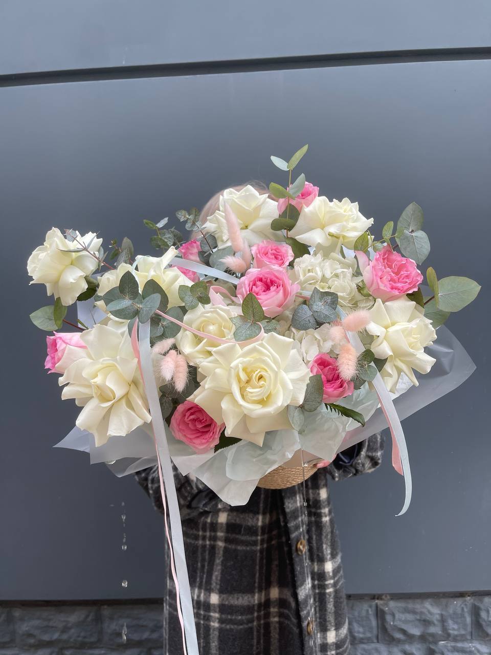 Воздушная гортензия окружает розы пудровых и снежных оттенков, а эвкалипт добавляет глубину и свежесть. Композиция собрана в натуральное джутовое кашпо, которое удобно разместить на столе или подоконнике.
