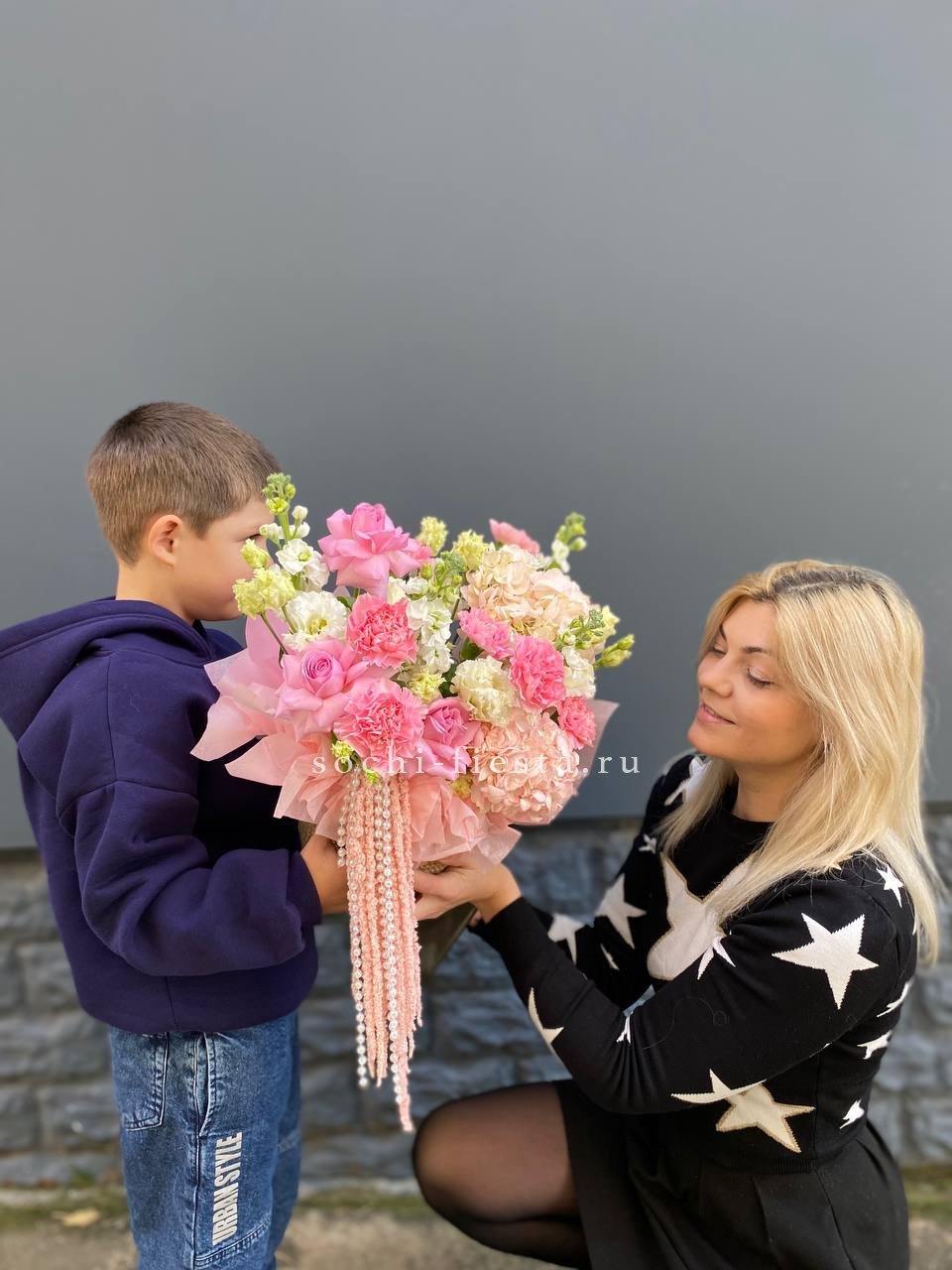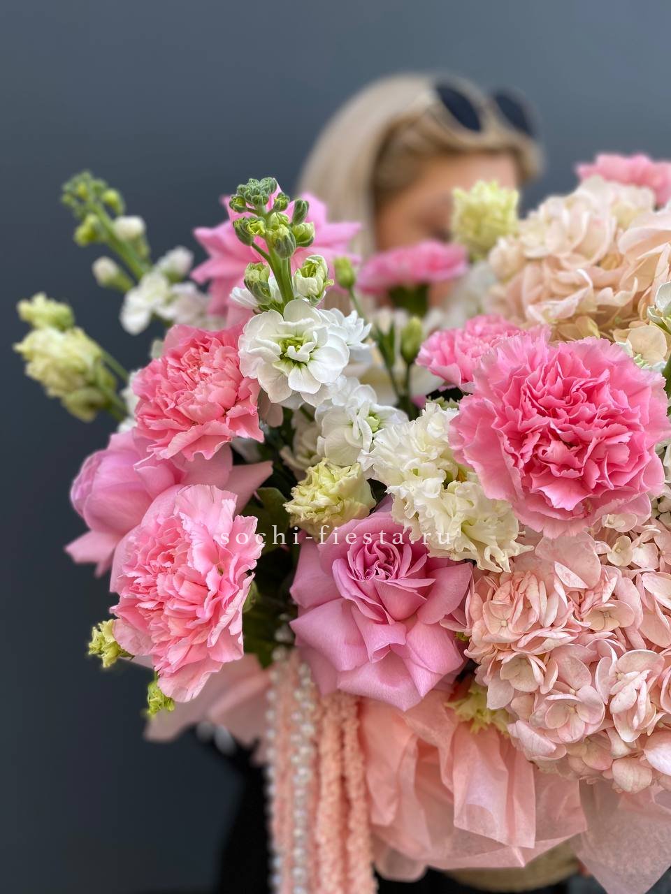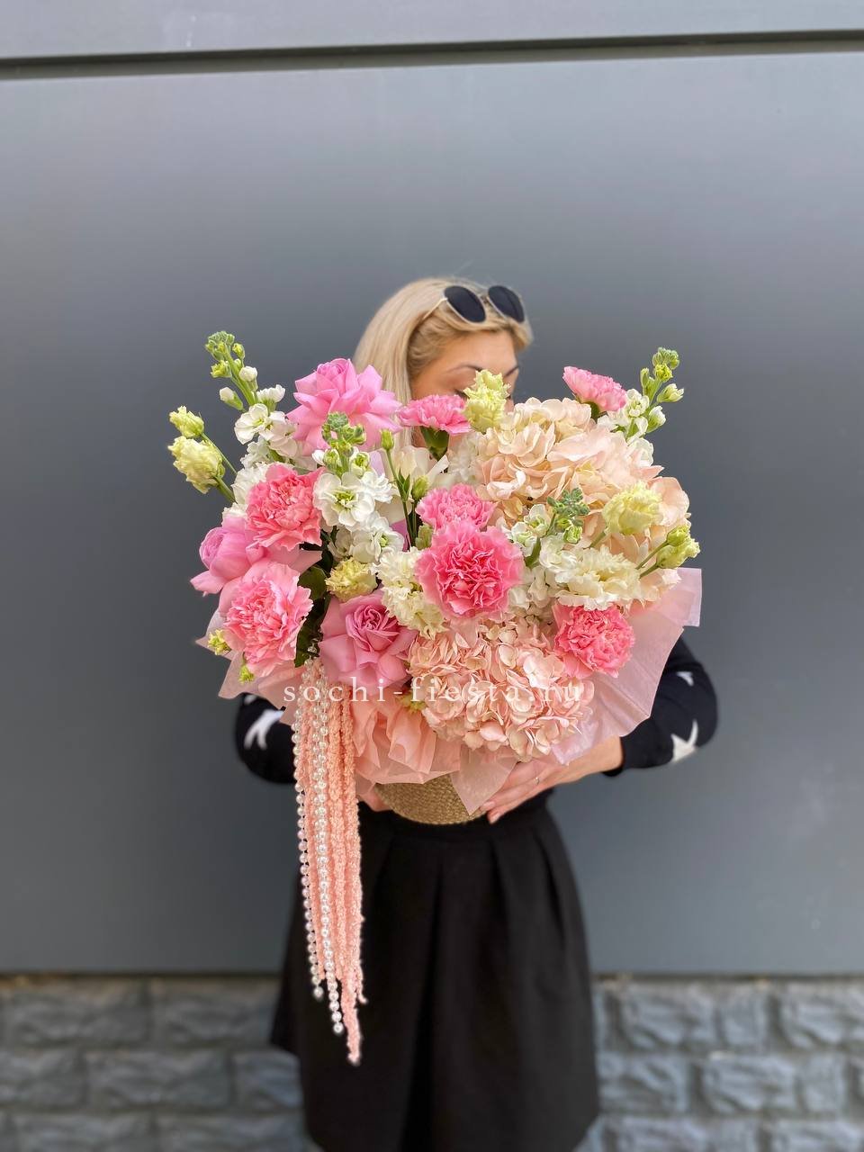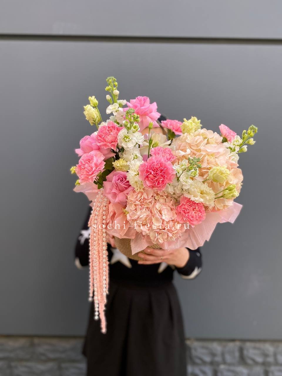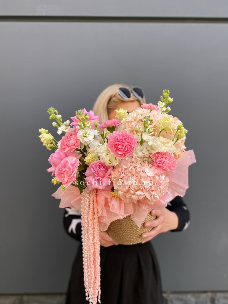 Состав: гортензия, диантус, розовые розы, маттиола, эустома, амарант, бусы (возможна замена), джутовое кашпо