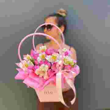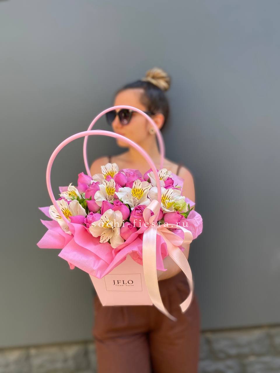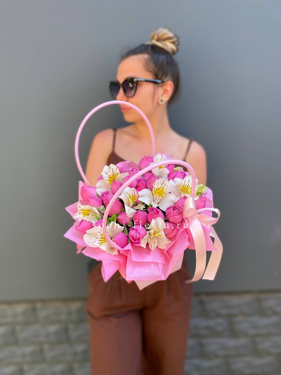 Состав: пионовидные кустовые розы, альстромерия, лента, сумка-кашпо.