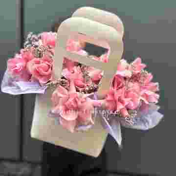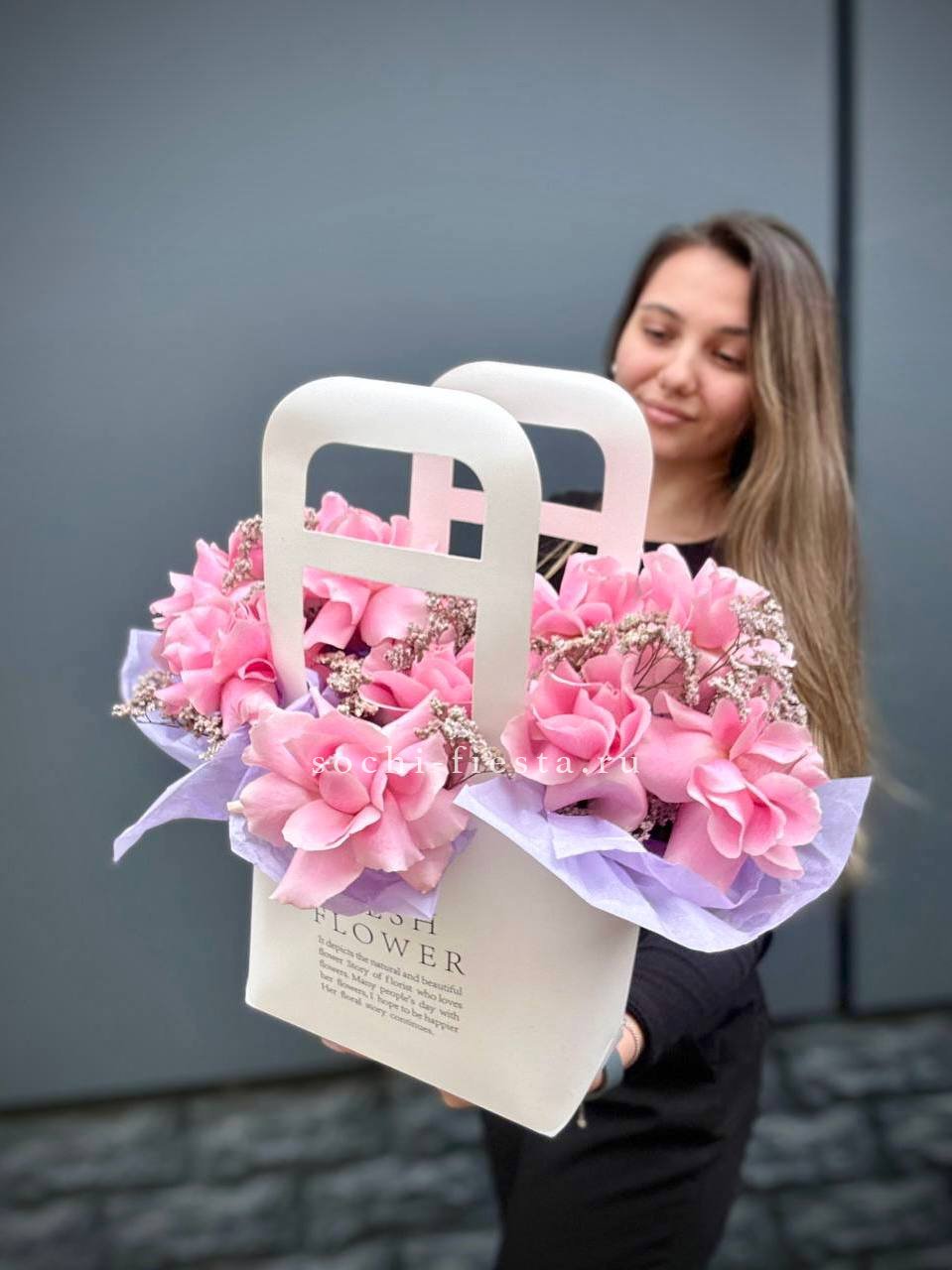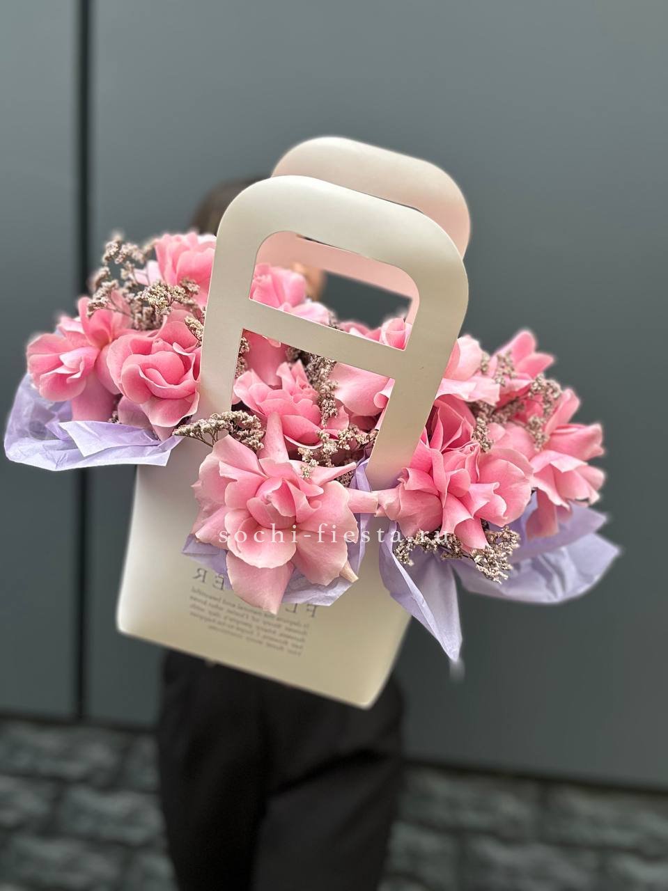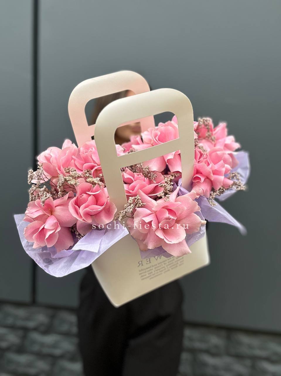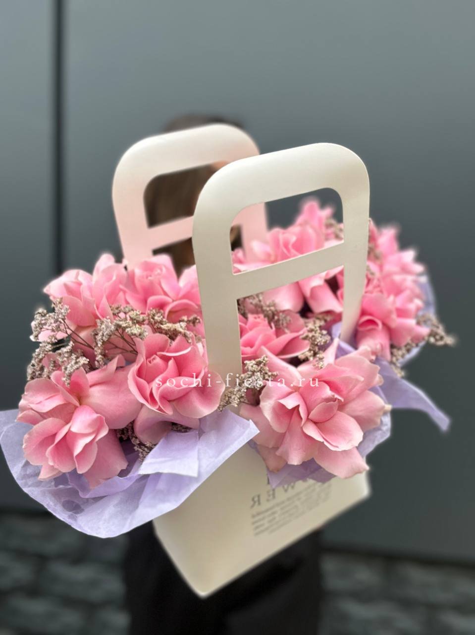Состав букета на фотографии: французские розы -11 шт., лента, сумочка