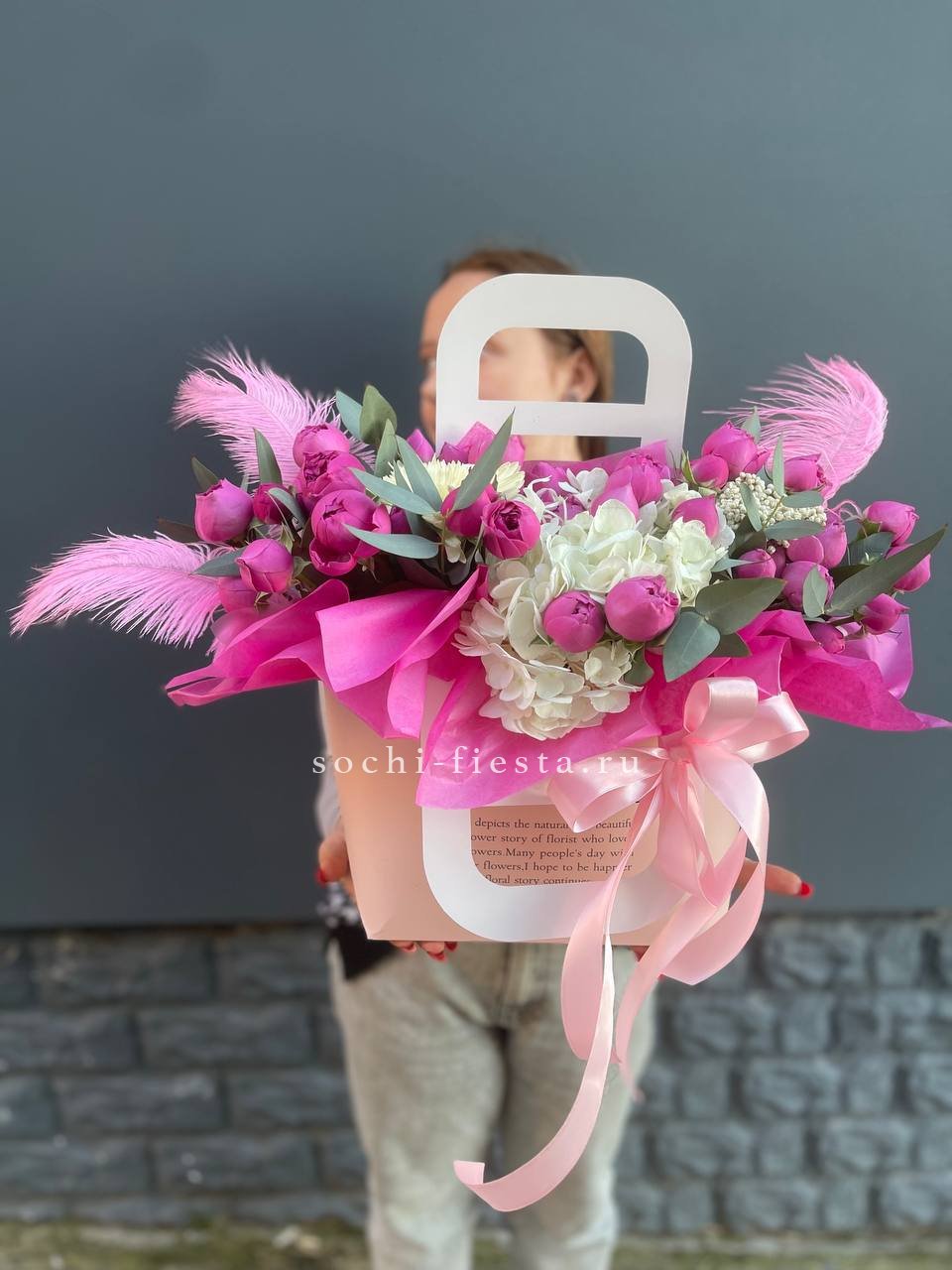 Состав: сумочка с гортензией, мисти баблс, герберой, озатамусом и эвкалиптом.