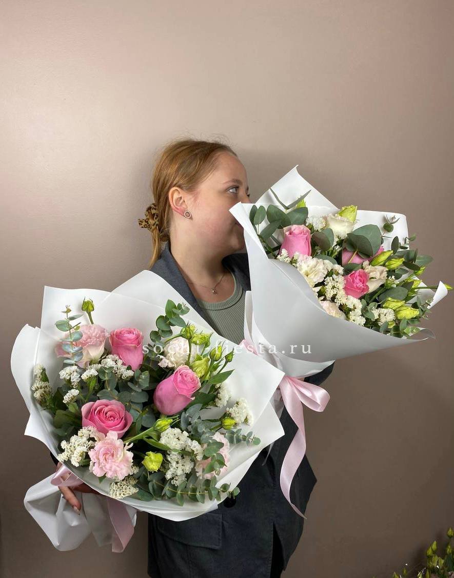 Состав: статица, роза, эустома, эвкалипт, пленка, лента